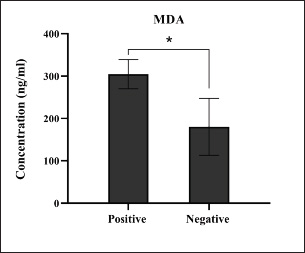 Fig. 15. Levels of lipid peroxidation MDA marker among the positively (total number=19) and negatively (total number=108) infected dogs with colibacillosis; significance * (p < 0.0105). ConclusionTo the best of our knowledge, this is the first study in Iraq to detect the prevalence rate of colibacillosis in pet dogs using traditional and molecular phylogenetic assays and demonstrate the susceptibility of E. coli strains to various antibiotics. This study also demonstrated that E. coli infection was associated with immune markers and antioxidants, which might indicate that a delicate balance between various infections and immune/antioxidant defense is crucial in determining disease outcome. However, regular surveys are needed to determine the effect of colibacillosis on other body enzymes, hormones, and tissues, as well as to investigate the effect of other pathogens on the health status of dogs. AcknowledgmentsThe authors thank all private clinic veterinarians who supported the clinical examination and collection of study samples. Conflict of interestThere are no conflicts of interest. FundingThe authors declare that no external funds (private funding) were received. Authors’ contributionMTJ: Measurement of immune markers; ASA: Measurement of antioxidant markers; AJA: Clinical examination and collection of fecal and blood samples; IME: Culture of fecal samples and biochemical testing of suspected E. coli isolates; HAJG: Molecular examination, phylogenetic and statistical analyses of study data. All authors equally contributed to the study design and approved the final copy of the manuscript. Data availabilityAll data were included in the study text. ReferencesAl-Kubaisi, S.M.A., Saed, O.A.S., Suleiman, J.M., Hasan, M.S., Owain, M.S. and Jarad, A.S. 2020. Isolation and identification of facultative anaerobic bacteria from pet dog feces. Med. Leg. Update 20(1), 785–798. Aslantaş, Ö. and Yilmaz, E.Ş. 2017. Prevalence and molecular characterization of extended-spectrum β-lactamase (ESBL) and plasmidic AmpC β-lactamase (pAmpC) producing Escherichia coli in dogs. J. Vet. Med. Sci. 79(6), 1024–1030. Banerjee, S., Ghosh, S., Mandal, A., Ghosh, N. and Sil, P.C. 2020. ROS-associated immune response and metabolism: a mechanistic approach with implication of various diseases. Arch. Toxicol. 94, 2293–2317. Bélanger, L., Garenaux, A., Harel, J., Boulianne, M., Nadeau, E. and Dozois, C.M. 2011. Escherichia coli from animal reservoirs as a potential source of human extraintestinal pathogenic E. coli. FEMS Immunol. Med. Microbiol. 62(1), 1–10. Bloom, D.E. and Cadarette, D. 2019. Infectious disease threats in the twenty-first century: strengthening the global response to the disease Front. Immunol. 10, 549–561. Bouacha, M., Besnaci, S. and Boudiar, I. 2023. An overview of the most commonly used methods for determining the in vitro antibacterial activity of honey. Acta Microbiol. Hell. 39(1), 23–30. Brauner, A., Söderhäll, M., Jacobson, S.H., Lundahl, J., Andersson, U. and Andersson, J. 2001. Escherichia coli-induced expression of IL-1 α, IL-1 β, IL-6 and IL-8 in normal human renal tubular epithelial cells. Clin. Exp. Immunol. 124(3), 423–428. Carvalho, A.C., Barbosa, A.V., Arais, L.R., Ribeiro, P.F., Carneiro, V.C. and Cerqueira, A.M.F. 2016. Resistance patterns, ESBL genes, and genetic relatedness of dogs and their owners to Escherichia coli. Braz. J. Microbiol. 47(1), 150–158. Chamoun, M.N., Blumenthal, A., Sullivan, M.J., Schembri, M.A. and Ulett, G.C. 2018. Bacterial pathogenesis and interleukin-17: interconnecting mechanisms of immune regulation, host genetics, and microbial virulence influence infection severity. Crit. Rev. Microbiol. 44(4), 465–486. Erzaim, N. and Ikiz, S. 2021. Phenotypic and mcr-1Mediated colistin resistance in Escherichia coli. Acta Vet. Eurasia 47(2), 82–87. Etcheverría, A.I., Lucchesi, P.M.A., Krüger, A., Bentancor, A.B. and Padola, N.L. 2016. “Escherichia coli in animals,” in Escherichia coli in the Americas. Ed., Torres, A.G. Cham, Switzerland: Springer International Publishing, pp: 149–172. Fairbrother, J.M. and Nadeau, É. 2019. Colibacillosis. In Diseases of the swine. Eds., Zimmerman, J.J., Karriker, L.A., Ramirez, A., Schwartz, K.J., Stevenson, G.W. and Zhang, J. Hoboken, NJ: John Wiley & Sons, Inc., pp: 807–834. Furukawa, R., Takahashi, K., Hara, Y., Nishimura, R., Furuya, K., Shingaki, T. and Ohmori, K. 2022. Clinical characteristics of dogs with chronic enteropathy presenting with vomiting as a gastrointestinal sign. Vet. Anim. Sci. 17, 10–25. Gaur, P., Hada, V., Rath, R.S., Mohanty, A., Singh, P. and Rukadikar, A. 2023. Interpretation of antimicrobial susceptibility testing using breakpoints from the European Committee on Antimicrobial Susceptibility Testing and Clinical and Laboratory Standards Institute: analysis of agreement. Cureus 15(3), 113–215. Gebremedhin, E.Z., Merga, D., Sarba, E.J., Marami, L.M., Tola, G.K. and Endale, S.S. 2021. Prevalence, risk factors and antibiogram of Escherichia coli isolated from dogs in Ambo, Gojo and Bako towns of Oromia region, Ethiopia. Ethiop. Vet. J. 25(1), 1–22. Gharban, H.A. and Yousif, A.A. 2020. Serological and molecular phylogenetic detection of Coxiella burnetii in Iraqi lactating cows. Iraqi J. Vet. Med. 44(E0), 42–50. Habib, I., Mohteshamuddin, K., Mohamed, M.Y.I., Lakshmi, G.B., Abdalla, A. and Bakhit Ali Alkaabi, A. 2023. Domestic pets in the United Arab Emirates as reservoirs for antibiotic-resistant bacteria: a comprehensive analysis of extended-spectrum beta-lactamase producing Escherichia coli prevalence and risk factors. Animals 13(10), 1587–1599. Hoffman, D., Amorim, J. and DeClue, A. 2018. Immune function in dogs with critical illness. J. Vet. Int. Med. 32(1), 208–216. Holzmann, B., Werner, M., Unterer, S. and Dörfelt, R. 2023. Utility of diagnostic tests in dogs with vomiting who presented to an internal medicine emergency service. Front. Vet. Sci. 10, 1