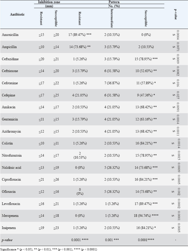 ABSTRACTBackground: Gastrointestinal disorders in dogs are important clinical conditions in veterinary medicine, which have multifactorial non-infectious and infectious etiologies. Colibacillosis, caused by Escherichia coli, is an infectious bacterial disease that contributes to host health and pathogenic variants that are responsible for a wide spectrum of diseases. Aim: This study aims to investigate the prevalence rate of gastrointestinal signs in diseased pet dogs, phylogenetic analysis of colibacillosis, measurement of antibiotic sensitivity, and levels of immune and antioxidant markers in dog populations. Methods: A total of 127 pet dogs admitted with various gastrointestinal signs were examined clinically. Fresh fecal samples were traditionally and molecularly analyzed to identify E. coli isolates for phylogenetic analysis and antibiotic susceptibility. The cephalic venous blood samples were examined quantitatively by enzyme-linked immunosorbent assay to measure immune markers such as interleukins (IL-1, IL-4, IL-6, and IL-8) and interferon-alpha (INF-α), as well as antioxidants such as catalase (CAT), glutathione (GSH), superoxide dismutase (SOD), and malondialdehyde (MDA). Results: Clinically, diarrhea was the most identified gastrointestinal sign in the study dogs. Traditional findings revealed that 14.96% of fecal samples were positive to E. coli isolates that showed a high sensitivity to antibiotics such as meropenem, levofloxacin, and ciprofloxacin with a significant resistance to amoxicillin and ampicillin. Molecularly, 78.95% of study isolates were positive to E. coli strains, which were found to be phylogenetically (NCBI-BLAST) identical to the Iraqi strain (LC844819.1). Serologically, elevated levels of IL-1, IL-6, IL-8, and MDA with reduced levels of IL-2, CAT, GSH, and SOD were observed in E. coli-positive dogs. However, no significant alteration was seen in values of INF-α among the dogs with and without colibacillosis. Conclusion: The present study represents a multifaceted analysis of the incidence rate of gastrointestinal disorders in pet dogs, prevalence rate of E. coli using traditional and molecular phylogenetic diagnostics, and the association of colibacillosis to immune and antioxidant markers in Iraq. Keywords: Canine gastrointestinal infections, Escherichia coli, Interferon, Interleukin, Oxidative stress, Iraq. IntroductionGastrointestinal disorders in dogs encompass a wide range of etiologies, ranging from acute self-limiting to chronic debilitating diseases requiring intensive management. Therefore, understanding the multifaceted nature of canine gastrointestinal health is crucial for effective diagnosis and therapeutic intervention (Isidori et al., 2022; Kollannur et al., 2024). The prevalence of infectious diseases poses a substantial threat to both animals and humans, with an estimated 60% of known pathogens and up to 75% of new or re-emerging diseases resulting in severe economic losses and global health impacts (Marks et al., 2011; Bloom and Cadarette, 2019). The emergence of antibiotic resistance in many bacterial species further compounds this challenge, threatening the efficacy of conventional treatments and necessitating innovative therapeutic strategies (Stachelek et al., 2021). However, gastrointestinal disorders in dogs frequently occur as a result of dysbiosis of gut microbiota, particularly alterations in the population dynamics of Enterobacteriaceae, including alterations in microbial diversity, reduction in beneficial organisms, and increase in potentially harmful ones (Pilla and Suchodolski, 2020; Ziese and Suchodolski, 2021). Colibacillosis is an important disease for humans and animals, as it is caused by Escherichia coli, a typical pathogenic bacterium (Poirel et al., 2018; Fairbrother and Nadeau, 2019). Escherichia coli is a highly diverse and adaptable Gram-negative bacterium, which was first identified in the 1885s and further characterized in the 1886s due to its dual nature, encompassing both commensal strains that contribute to host health and pathogenic variants that are responsible for a wide spectrum of diseases (Riley, 2020; Ruiz and Silhavy, 2022). Commensal strains play beneficial roles in nutrient processing, immune protection, and vitamin K production; however, some strains are pathogenic and can induce various intestinal and extraintestinal diseases (Namazi et al., 2019; Ramos et al., 2020; Riley, 2020). In recent decades, the remarkable adaptability of E. coli has emerged due to its capacity to rapidly evolve and acquire new traits through horizontal gene transfer, mutation, and recombination, leading to the emergence of novel pathotypes and antimicrobial resistance (Nasrollahian et al., 2024; Saini et al., 2024). Diagnostic scrutiny often necessitates a multifaceted approach, integrating historical data, physical examination findings, and laboratory analyses to pinpoint the causative factors and initiate targeted treatment intervention (Riaz et al., 2023; Singh et al., 2024). In Iraq, few studies have been performed in dogs to determine the virulence genes of the pathogenic E. coli or its antimicrobial resistance (Yousif et al., 2016; Al-Kubaisi et al., 2020; Kadhim and Alrammah, 2024; Taalab et al., 2024). Hence, this study aimed to investigate the prevalence rate of colibacillosis in dogs with gastrointestinal infections based on clinical, traditional, and molecular data and to measure the levels of immunity and antioxidants in the dogs. This study also determined the incidence of antimicrobial resistance in the E. coli isolates. Materials and MethodsAnimal data and samplesA total of 127 diseased dogs with different clinical gastrointestinal signs were admitted to the private clinics located in Wasit province (Iraq) from October 2024 to March 2025. Initially, fresh fecal samples were collected from each animal into labeled plastic containers. Then, 2.5 ml of cephalic vein blood was collected from each animal and pla