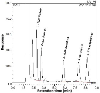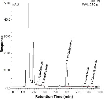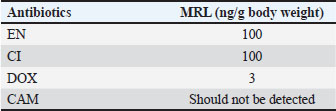 ABSTRACTBackground: Antibiotics are widely used in veterinary medicine; consequently, drug residues may remain in animal-based foods and cause adverse health effects in consumers. Thus, this study aimed to establish a screening method for residual investigation in different types of meat. Aim: This study aimed to develop and validate a high-performance liquid chromatography-ultraviolet method for the simultaneous determination of ciprofloxacin (CI), enrofloxacin (EN), doxycycline (DOX), and chloramphenicol (CAM) in poultry, red meat, and fish products and to investigate their residues in different meat samples. Methods: The targeted analytes with ondansetron as an internal standard were extracted from various meat matrices using acetonitrile in a single process step. Separation was achieved using an ACE®️ C18 column (10 cm, 4.6 mm i.d., 5 µm) with a mobile phase of 0.2% formic acid: acetonitrile (22:78, v/v) at a flow rate of 0.7 ml/minute. Detection was performed at a fixed wavelength of 280 nm with a runtime of 10 minutes. The developed method was validated for selectivity, linearity, sensitivity, accuracy, precision, and recovery following the European guideline EMA 2012. To evaluate the presence of the targeted antibiotic residues, 13 poultry, 25 red meat, and 3 fish samples were randomly collected from the local market. Results: The validation results for each analyte met the acceptable criteria. The targeted analytes exhibited a linear curve over the dynamic range of 10–1,000 ng/g for CI and EN, 80–8,000 ng/g for DOX, and 50–500 ng/g for CAM. Most of the randomly collected poultry and red meat samples contained CI residues. A few samples contained EN and DOX residues, whereas no CAM was detected in any of the collected samples. Conclusion: The developed method was successfully validated and applied to investigate antibiotic residues in various meat types. Keywords: Poultry, Red Meat, Fish, Antibiotic residues, Food safety. IntroductionAntibiotics are widely used in veterinary medicine; consequently, drug residues may remain in animal-based foods and may cause adverse health effects in consumers (Chanda et al., 2014). Human exposure to substantial antibiotic residues from animal products may exacerbate immune responses in susceptible individuals and negatively influence the intestinal microbiota (Normanno et al., 2007). Moreover, the irrational use of antibiotics is associated with the development of antibiotic-resistant strains, making antibiotics ineffective as therapeutic agents (Babapour et al., 2012). Antibiotics are essential in the poultry industry to prevent and reduce the incidence of infectious diseases. They are also used illegally as feed additives to promote animal growth and productivity (CAC, 2018). Some developed countries, including Sweden, Norway, Denmark, and the European Union, have already prohibited the use of antibiotics as growth promoters and for prophylaxis (Maron et al., 2013). Over the last few decades, antibiotics have been frequently used in animal husbandry for prophylactic and therapeutic purposes. Almost one-third of the antibiotics used in Europe are for veterinary applications, with the majority of antibiotics used for therapeutic purposes in poultry and pig livestock (Landers et al., 2012). Hence, the European Commission has established maximum residue limits (MRLs) in foodstuffs of animal origin and listed them in the Commission Regulation [European Union (EU)] No. 37/2010 (European Commission, 2010). MRLs have been set to avoid exposing end consumers to antibiotic residue risks. By regulation, the EU does not allow foodstuffs such as beef, milk, red meat, fish, and eggs to contain residual amounts of veterinary medicinal products or antibiotic products that are likely to expose public health to serious risk. The rules and procedures for setting up MRLs are described in Regulation (EC) No. 470/2009 of the European Parliament and the Council (European Union, 2009). This is not the case in developing or underdeveloped countries, where safety requirements and legislation are often inadequate or absent. Fluoroquinolones, such as ciprofloxacin (CI) and enrofloxacin (EN), have been licensed as veterinary drugs for three decades. They inhibit the catalytic activity of bacterial DNA gyrase with low toxicity and broad-spectrum activity. CI and EN are prescribed to treat or prevent infectious diseases in farm animals, including chickens, turkeys, and beef (Baiphethi and Jacobs, 2009; European Union Food and Veterinary Office, 2015). Tetracyclines are a large family of antibiotics with broad-spectrum activity that are naturally produced by Streptomyces species. Four tetracyclines are extensively used as veterinary antibiotics: tetracycline, chlortetracycline, oxytetracycline, and doxycycline (DOX) (Granados-Chinchilla and Rodríguez, 2017). The World Health Organization and the Food and Agriculture Organization recommend that tetracycline MRLs not exceed 200, 600, and 1,200 µg/kg in the liver, muscles, and kidneys, respectively (CAC, 2018). Chloramphenicol (CAM) is a broad-spectrum antibiotic with historical veterinary uses because of its low cost (Laxminarayan et al., 2013). The presence of CAM and its metabolites in foods, even at trace levels, represents a severe health risk. In addition to contributing to the development of resistant bacterial strains, CAM causes bone marrow depression and aplastic anemia (Shukla et al., 2011). Therefore, finding CAM or its metabolites in any food product is not acceptable. Competent authorities have not set MRLs for CAM in food products (Barton, 2000). Table 1 shows some accepted MRL values for meat residues of veterinary drugs. Table 1. Maximum residue limits (MRLs) for veterinary antibiotic residues.