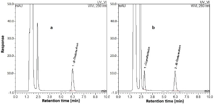 Fig. 5. Representative chromatograms for (a) a fish sample that did not contain any of the target analytes and (b) a poultry sample containing 592.73 ng/g CI. Table 6. Representative measurements of CI, EN, DOX, and CAM in poultry, fish, and red meat samples expected to contain antibiotic residues.