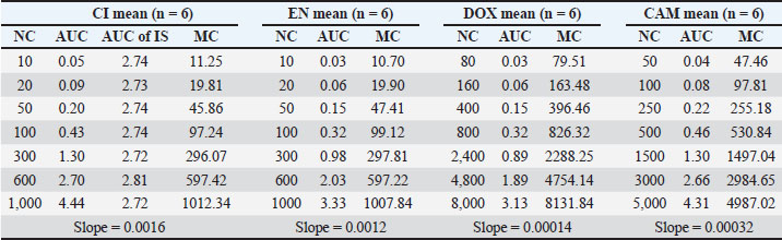 Calibration curveThe repeated analysis of CC for each of CI, EN, DOX, and CAM through validation days has exhibited a reproducible slope with a good regression value, as shown in Table 4 for the parameters summary of six replicate analyses for CC spiked in poultry blank meat, where all calibrators were within the acceptance criteria. The linear curve data were best-fit to a straight line with a weighting factor of 1/x regression function, and it was used to calculate the concentrations of all samples throughout the batch. Figure 4 shows how the relationship between the established dynamic range and the corresponding response for each analyte is perfect.
