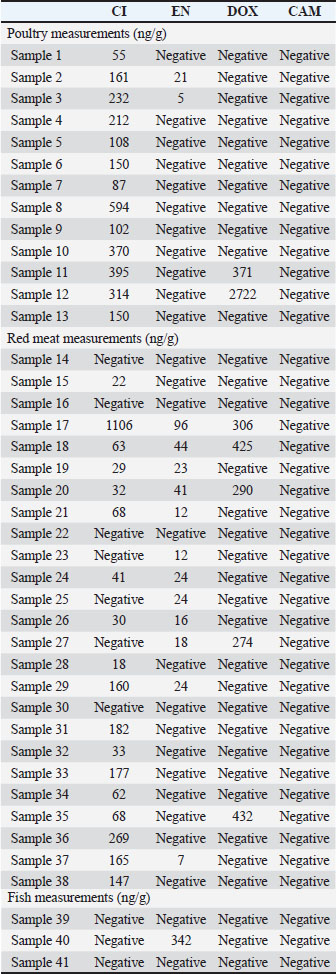 DiscussionAll the validation results for each analyte met the acceptable criteria of the guidelines. The method was applied to unfrozen meat samples that were freshly collected. Most of the randomly collected poultry and red meat samples contained CI residues. A few samples contained EN and DOX residues, whereas no CAM was detected in any of the collected samples. It was found that 100% of the poultry samples were contaminated with CI, 15% with EN, 15% with DOX, and 0% with CAM. Among the red meat samples, 80% were contaminated with CI, 48% with EN, 20% with DOX, and none with CAM. For the fish samples, 33% were contaminated with EN, while 0% were contaminated with CI, DOX, or CAM. Negative values in Table 6 indicate that the analyte was not detected, and no measurable peak corresponding to the analyte was observed at its retention time. These findings are consistent with those of previous studies, showing the common use of fluoroquinolones and tetracyclines in livestock production. The complete absence of CAM, a drug banned in food animals under EU law, may reflect some degree of regulatory enforcement. Compared with previous studies, including our earlier work on milk matrices (Muti et al., 2021), this study expands the application of HPLC-UV to solid meat tissues using a single, rapid, and cost-effective method. The novelty of the study lies in the simultaneous quantification of four antibiotics in three different meat matrices, which is not commonly addressed in a single UV-based assay. The method’s simplicity and adaptability make it suitable for routine use in laboratories with limited access to advanced equipment, such as liquid chromatography-tandem mass spectrometry (LC-MS/MS). This highlights the importance of monitoring veterinary drug residues in food products for public health and supports the need for tighter regulation and routine screening, especially in developing countries. ConclusionThis study clearly showed that poultry, red meat, and fish were not completely free from antibiotic residue. Some residue levels were above the MRL recommended limit according to the European Union EC. The developed method for the simultaneous determination of CI, EN, DOX, and CAM in different meat matrices using HPLC-UV was successfully validated following the European guidelines and then applied to investigate the residues of targeted antibiotics in poultry, red meat, and fish products. Some antibiotic residues were detected at higher concentrations than the accepted MRLs. This study has been conducted to increase the awareness and the risk of antibiotic residues on the health of people and will encourage the competent authorities to regulate and take the necessary measures to provide healthy meat free from antibiotic residues for humans. AcknowledgmentsThe authors acknowledge the Deanship of Scientific Research at Al-Ahliyya Amman University, Amman, Jordan, for their financial support and the support of the Jordan Center for Pharmaceutical Research (JCPR) for their facility. Conflict of interestThe authors declare no conflict of interest. FundingNo external funding was provided. Authors’ contributionsAll authors contributed to this study and contributed either by experimental application or manuscript writing and revision. Data availabilityAll data supporting this study’s findings are available upon reasonable request. ReferencesArslanbas, E. 2018. Determination of antibiotic residues in meat samples using high-performance liquid chromatography. Erciyes Univ. Vet. Fak. Derg. 13, 247–252. Babapour, A., Azami, L. and Fartashmehr, J. 2012. Overview of antibiotic residues in Iranian beef and mutton. World Appl. Sci. J. 19, 1495–1500. Baiphethi, M.N. and Jacobs, P.T. 2009. Subsistence farming’s contribution to food security in South Africa. Agrekon 48, 459–482. Barton, M. D. 2000. Antibiotic use in animal feed and its impact on human health. Nutr. Res. Rev. 13, 279–299. CAC. 2018. The codex alimentarius commission maximum residue limits for veterinary drugs in foods. Rome, Italy: Food and Agriculture Organization/WHO, Vol. 2. Chan, C.L., Wai, H.K.F., Wu, P., Lai, S.W., Chan, O.S.K. and Tun, H.M. 2022. Prevalence of antibiotic residues in meat: a systematic review. Antibiotics 11, 845. Chanda, R.R., Fincham, R.J. and Venter, P. 2014. Veterinary drug residues in animal products: health implications. Crit. Rev. Food Sci. Nutr. 54, 488–494. Elsayed, A.S., Abusham, A., Al-Touby, S.S.J., Al Rajhi, W.K.H. and Hossain, M.A. 2023. Antibiotic residue detection in meat using LC-MS. Food Anal. Methods 16, 1618–1626. European Commission. 2010. Commission Regulation (EU) No 37/2010 on pharmacologically active substances and their classification. Union L15, 1–72. European Medicines Agency (EMA). 2012. Framework for a correlation table (VNeeS:CTD) for ASMFs/Part 2 in CTD format for dossiers for veterinary medicinal products. Reference No. EMA/115282/2012. European Union Food and Veterinary Office. 2015. Final report of an audit on the control of residues. European Union Food Vet. Off. 1, 1–16. European Union. 2009. Regulation (EC) No 470/2009 of the European Parliament and of the Council. Off. J. Eur. Union L 152, 11–22. Government of Canada. 2015. Health Canada veterinary drugs directorate. Summary report. Drugs Direct 1, 1–101. Granados-Chinchilla, F. and Rodríguez, C. 2017. Tetracyclines in food and feedingstuffs: from regulation to analytical methods, bacterial resistance, and environmental and health implications. J Anal Methods Chem. 2017, 1315497. Kamouh, A., Al-Kaf, A.G., Al-Kaf, M.A., Baqir, S.J., Al-Sharafi, W.A. and Al-Mansoury, R.M. 2024. Detection of antibiotic residues in broiler meat marketed in Dhamar city, Yemen, and the effect of boiling on residue levels. Open Vet. J. 14, 438–448. Landers, T.F., Cohen, B., Wittum, T.E. and Larson, E.L. 2012. A review of antibiotic use in food animals: perspective, policy, and potential. Public Health Rep®. 127(4), 4–22. La