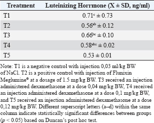 Administering toxic doses of dexamethasone resulted in higher cortisol levels than low-dose dexamethasone, although the difference was not statistically significant. Toxic doses of dexamethasone produced more pronounced immunosuppressive effects and cortisol suppression than flunixin meglumine. Significant cortisol suppression was due to glucocorticoid activity, which directly reduces HPA axis activity (Kleinhenz et al., 2017). Dexamethasone can work optimally when administered at the recommended dosage. Higher doses may increase the risk of toxicity to the body. The main side effects of excessive dexamethasone use include a decrease in white blood cell count, thymus and spleen atrophy, and reduced adrenal gland weight. The effects of toxic-dose dexamethasone may trigger significant stress responses in goats, including excessive activation of the HPA axis (Niu et al., 2018). Dexamethasone suppresses cortisol production through harmful feedback mechanisms. Toxic doses can lead to endocrine system dysregulation, resulting in persistently high cortisol levels (Sic et al., 2024). Table 2. The mean luteinizing hormone levels (ng/ml) with a treatment in female dairy goats with subclinical mastitis (n=20).