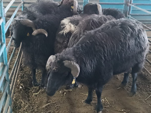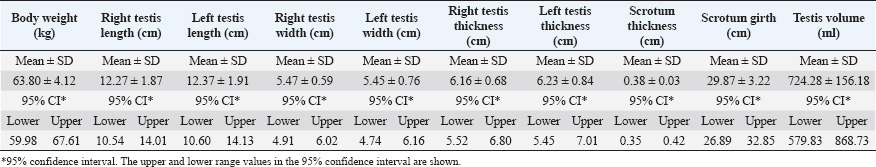 Fig. 1. A view of the Southern Karaman breed rams used in the research. Morphometric measurementsAfter determining the body weights, the scrotal thickness and girth, length and width of each testicle, including the epididymis over the scrotum, and the thickness of each testicle over the scrotum were measured. Morphometric measurements of the reproductive organs were recorded in “cm”. To measure the volume of the testicles, a 2 l container was filled with water at 37°C, and both testicles were immersed in the water. The volume of overflowing water in this container, including both the testicles and scrotum, was determined as the testicular volume in “ml” (Aksoy et al., 1994; Gündoğan et al., 2003; Türk et al., 2005). Semen collectionSince semen could not be collected from the rams by artificial vagina during the breeding season, semen was collected using an electro-ejaculator in accordance with the technique. During this process, the rams were kept in a special area and under physical restraint, and animal welfare rules were respected. Semen analysesRoutine semen examination, volume, mass activity, motility, concentration, viability ratio, and morphologic examination were performed. VolumeThe volume of semen was recorded in “ml” by reading according to the measurement lines on the graduated semen collection goblet. Mass activityA small drop of fresh semen was placed on a slide on a heating table set at 37°C. The mass activity was examined under a microscope at 10 × 10 magnification without covering the slide with a coverslip. Three different fields were examined, and a score between 0 and 5 was assigned (Hafez, 1987; Bearden et al., 1992). MotilityFirst, a clean slide was placed on a heating plate set at 37°C and heated. Subsequently, 0.5 ml of Tris-based diluent [Tris (3.63 g), fructose (0.5 g), citric acid (1.99 g), and distilled water (100 ml)] (Gündoğan et al., 2010) and 3 μl of fresh semen were placed on the slide, and the coverslip was closed. Motility was determined under a microscope at 10 × 40 magnification. The evaluation was performed by averaging the motility rates in at least 3 different fields and recording a value between 0% and 100 % (Hafez, 1987; Bearden et al., 1992). ConcentrationSemen concentration was determined using the hemocytometric method (Bearden et al., 1992; Demirci, 2000). Viability ratioA smear slide was prepared with semen samples and stained using the Eosin-Nigrosin stain (Sönmez and Demirci, 2004). The spermatozoa with pink-stained heads were considered dead, and those without staining were considered viable, and the viability ratios were calculated. The results were recorded as “%”. Morphological examination (abnormal sperm ratio)To determine the abnormal sperm rate in semen samples, we prepared slides using Tile ink. The proportion of abnormally shaped spermatozoa was expressed as “%” (Bearden et al., 1992; Demirci, 2000). Determination of testosterone hormone levelsTestosterone levels in serum samples obtained from the animals at the end of the study were determined by the ELISA method. The blood serum samples obtained from the animals were read in a special device with the help of commercial testosterone kits (Sheep Testosterone, T ELISA Kit), and the results were recorded as “ng/ml”. Statistical analysisA post hoc power analysis was performed using the G*Power 3.1 software. Assuming an effect size of d=1.0 (large), α=0.05, and a sample size of n=7, the statistical power (1−β) was calculated as approximately 0.77. Despite the limited sample size, this indicates a moderately high probability of detecting a true effect, which is common in studies involving endangered or rare livestock breeds. One-sample t-tests were conducted to compare Southern Karaman semen parameters with known means from published studies on Akkaraman and Karayaka breeds. The total motility (81.42% ± 12.14%) of Southern Karaman rams was not significantly different from that of Akkaraman rams (mean=81.7%, p > 0.05), suggesting comparable fertility potential (Gündoğan et al., 2002). A Pearson correlation test was conducted to determine the possible relationship between morphometry and spermatological traits. Statistical analyses, including one-sample t-tests and Pearson correlation, were performed according to the methods described by Petrie and Watson (2013). Data were analyzed using the SPSS V.22 package program. Descriptive statistics were used to summarize the study data. In order to reveal reference values, the lowest and highest values in the 95% confidence interval were calculated. Data are presented as mean and standard deviation. Ethical approvalThe approval certificate (16.08.2024/178) was obtained from the Local Ethics Committee of the Ministry of Agriculture and Forestry, Bahri Dağdaş International Agricultural Research Institute Directorate. ResultsMorphometric resultsTable 1 shows the body weights, right and left testicular length, width and thickness values, scrotal thickness and girth values, and testicular volumes of Southern Karaman breed rams. Spermatological resultsThe average volume of semen collected from Southern Karaman rams was 0.64 ± 0.22 ml. The mean mass activity score of the semen was 4.28 ± 0.95, while the average total motility value was determined as 81.42% ± 12.14%. The mean sperm concentration in the semen of Southern Karaman rams was 1688.57 ± 429.24 × 106 sperm ml−1. Regarding sperm viability, the average live sperm ratio was found to be 79.00% ± 3.26%, whereas the average dead sperm ratio was 21.00% ± 3.26%. Morphological examination revealed that the average total abnormal sperm ratio was 3.85% ± 1.21%. Testosterone hormone levelThe average serum testosterone level of Southern Karaman rams was 4.91 ± 0.74 ng/ml. Because of the research, all spermatological findings and serum testosterone levels of Southern Karaman rams are shown in Table 2. DiscussionBody weight, morphometric measurements of 