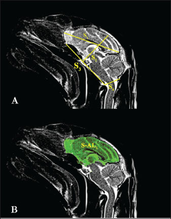 Fig. 1. S1, S2, S3, S4, and S-AL1 measurement parameters in T2 sagittal MRI images of the Van cat. (A) S1: length of the prosencephalon, S2: height of the encephalon, S3: base length of the encephalon, S4: dorsoventral length of the foramen magnum. (B) S-AL1: midsagittal surface area of the prosencephalon. S2: Encephalon height (Fig. 1A). S3: Encephalon base length (Fig. 1A). S4: Dorsoventral length of the magnum of the foramen (Fig. 1A). S-AL1: Prosencephalon’s midsagittal surface area (Fig. 1B). Dorsal measurementsD1: Encephalon width (Fig. 2A).