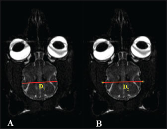 Fig. 2. D1 and D2 measurement parameters in T2 dorsal MRI images in the Van cat. (A) D1: encephalon width. (B) D2: cavum cranii width. D2: The width of the cavum cranii (Fig. 2B). D3: The longest distance of the fissura longitudinalis cerebri cranialis (Fig. 3A).