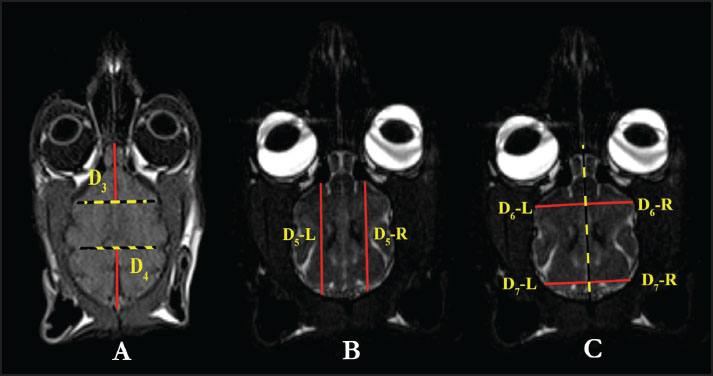 Fig. 3. D3, D4 measurement parameters in T1 dorsal MRI images and D5, D6, and D7 measurement parameters in T2 dorsal MRI images in the Van cat. (A) D3: longest distance of the fissura longitudinalis cerebri cranialis, D4: longest distance of the fissura longitudinalis cerebri caudalis. (B) D5-L: longest craniocaudal distance of the hemispherium cerebri sinister, D5-R: longest craniocaudal distance of the hemispherium cerebri dexter. (C) D6-R: distance indicating the longest frontal width of the hemispherium cerebri dexter, D6-L: distance indicating the longest frontal width of the hemispherium cerebri sinister, D7-R: distance indicating the longest occipital width of the hemispherium cerebri dexter, D7-L: distance indicating the longest occipital width of the hemispherium cerebri sinister. D4: The longest distance fissura longitudinalis cerebri caudalis (Fig. 3A). D5-L: The longest craniocaudal distance of the left hemisphere (hemispherium cerebri sinister) (Fig. 3B). D5-R: The longest craniocaudal distance in the right hemisphere (hemispherium cerebri dexter) (Fig. 3B). D6-R: The longest frontal width of the right hemisphere (hemispherium cerebri dexter) (Fig. 3C). D6-L: The longest frontal width of the left hemisphere (hemispherium cerebri sinister) (Fig. 3C). D7-R: The longest occipital width of the right hemisphere (hemispherium cerebri dexter) (Fig. 3C). D7-L: The longest occipital width of the left hemisphere (hemispherium cerebri sinister) (Fig. 3C). D-AL1: Total dorsal surface area of the right and left hemispheres (Fig. 4A).