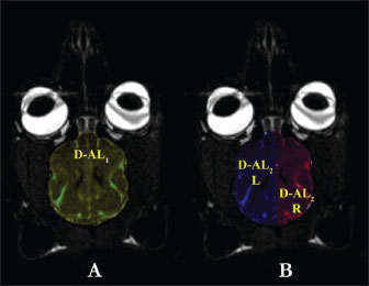 Fig. 4. D-AL1 and D-AL2 measurement parameters in T2 dorsal MRI images in the Van cat. (A) D-AL1: total dorsal surface area measurement of the right and left hemispherium cerebri. (B) D-AL2/R: dorsal surface area of the hemispherium cerebri dexter, and D-AL2/L: dorsal surface area of the hemispherium cerebri sinister. D-AL2/R: Dorsal surface area of the right hemisphere (H. cerebri dexter) (Fig. 4B). D-AL2/L: Dorsal surface area of the left hemisphere (H. cerebri sinister) (Fig. 4B). Statistical analysisDescriptive statistics were used, and data are presented as mean and SD. Differences in measurement parameters between sexes were assessed using the Mann–Whitney U test. The Wilcoxon test was used to analyze the directional differences between the right and left hemispheres. The Mann–Whitney U and Wilcoxon tests indicate that there is sufficient evidence to support the hypothesis that there is a difference between groups if the p < 0.05. Specifically, a p of 0.05 suggests a statistically significant difference between the groups. All statistical analyses were performed using the IBM® SPSS® Statistics V21 software package. Ethical approvalThis study was approved by the Animal Experiments Local Ethics Committee of the Van Yuzuncu Yil University, dated November 25, 2021, under decision number 2021/11-12. ResultsSagittal measurement findingsTable 1 shows the analysis server of the study, prosencephalon length, encephalon base length, and dorsoventral length of the foramen magnum in male Van cats. These measurement values exhibited a statistically positive difference (p < 0.05) in male Van cats (Table 1). Contrary to these measurements, the mean encephalon height was 30.86 mm in males and 30.00 mm in females, and no significant difference was observed between the sexes (p=0.099) (Table 1). The prosencephalon surface area was also determined to be 659.54 mm2 in male Van cats and 606.15 mm2 in females. In this context, it was determined that male cats had a larger prosencephalon surface area than female cats (p=0.001) (Table 1). Table 1. The mean values and SD sagittal MRI measurement parameters in Van cats according to the sexes.