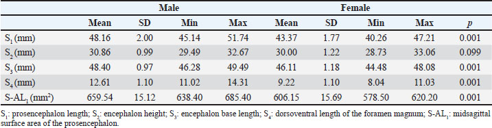 Additionally, to reveal the brain asymmetry status in Van cats, the hemispherium cerebri dexter and sinister surface areas were evaluated separately in male and female sexes. In this context, the dorsal surface area of the right hemisphere was significantly larger than that of the left hemisphere in both male and female Van cats (p=0.001) (Table 3). DiscussionThis study aimed to determine some morphometric measurements of brain tissue in Van cats using Turbo spin echo (TSE)-T2 and T1-weighted sagittal and dorsal MRI, and to evaluate brain asymmetry in Van cats using standard MRI sequences. Previous studies have applied MRI to examine brain tissues in various species, including sheep (Lee et al., 2015), horses (Arencibia et al., 2001), camels (Emam et al., 2020), rabbits (Müllhaupt et al., 2015), foals (Chaffin et al., 1997), and dogs (Lipsitz et al., 2001; Leigh et al., 2008). MRI, especially TSE-T2-weighted imaging, plays an important role in neuroanatomical assessments due to its capacity to provide detailed structural information (Leigh et al., 2008). Therefore, our study was conducted in Van cats by obtaining sagittal and dorsal TSE-T2 and T1 sequence images using a 1.5 T MRI. According to the results of our sagittal measurements, the mean prosencephalon length of male Van cats was 48.16 mm, whereas that of female Van cats was 43.37 mm. Male Van cats have a significantly longer prosencephalon than female Van cats. In addition, male Van cats have a longer encephalon base and a larger foramen magnum dorsoventral diameter compared to female Van cats. These measurements show a clear sex-related difference in brain size. Similar trends have also been observed in humans; male brains are generally larger (Reinstrup et al., 2019). We believe that the possible reason for this is that male Van cats of the same age weigh more than female Van cats. In a study conducted by Kavoi and Jameela (2011), the average brain length was reported to be 168.86 mm in humans, 66.67 mm in dogs, and 66.50 mm in goats. Our data contribute to the literature by providing detailed morphometric measurements of Van cats. Again, within the scope of our sagittal measurements, we determined the encephalon height between male and female Van cats. The encephalon height in male Van cats was determined to be 30.86 mm, and in female Van cats was 30.86 and 30.00 mm, respectively, and we did not find a statistically significant difference between the sexes (p=0.099). This finding is consistent with that by Przyborowska et al. (2017), who reported similar results for the European Shorthair breed. Although there are differences in encephalon height between cat breeds, our data show that sex does not significantly affect this measurement in Van cats. In our study, the dorsal width of the encephalon and the dorsal diameter of the cavum cranii, which are included in the dorsal measurements of the brain, were determined to be an mean of 35.90 ± 1.99 and 37.73 ± 1.85 mm in male Van cats, respectively, and an mean of 33.81 ± 0.85 and 35.60 ± 0.70 mm in female Van cats, respectively. The encephalon width and cavum cranii diameter were larger in males than in females. This gender difference reported in our study is similar to the results of studies conducted in humans (Karakaş et al., 2011; Taştemur et al., 2017; Polat et al., 2019). This sex difference reported in our study is similar to the results of studies conducted in humans (Karakaş et al., 2011; Taştemur et al., 2017; Polat et al., 2019). Furthermore, when looking at the results of dorsal measurements, our study found that H. cerebri dexter exhibited larger frontal and occipital widths than H. cerebri sinister in both sexes. This is consistent with the findings of Siniscalchi et al. (2011) in dogs, who reported that most subjects had a larger hemispherium cerebri dexter. In our study, within the scope of surface area results, the dorsal surface area of H. cerebri sinister, dorsal surface area of H. cerebri dexter, and the total surface area of encephalon measurement parameters were compared in terms of sex. In this context, it was observed that these measurement parameters were 547.71 ± 48.63, 560.89 ± 39.78, and 1,108.60 ± 26.05 mm2 on mean in male Van cats, and 496.16 ± 17.05, 522.54 ± 27.89, and 1,018.70 ± 17.05 mm2 on mean in female Van cats, respectively. The results of our study are statistically consistent with the results of the study by Yücel (2019), and a positive difference was detected in terms of male sex. Since it was determined that the human brain is asymmetric in terms of structure and function, anatomical brain asymmetries have been studied in vivo using methods such as volumetric measurements of certain anatomical structures (Amunts et al., 2000; Yuecel et al., 2001). Recently, with the advancing technological developments, it is suggested to examine brain asymmetry status with new techniques such as basic brain imaging. The most important of these techniques are voxel-based morphometry and MRI measurement analyses (Ashburner and Friston, 2000; Davatzikos and Resnick, 2002). When our study was examined, it was seen that the average widths of the Lobus frontalis and occipitalis dexter in male Van cats were 14.37 ± 0.64 and 13.13 ± 1.16 mm, respectively, and in female Van cats, the means were 15.00 ± 0.53 and 12.46 ± 0.23 mm, respectively. The mean widths of the lobus frontalis and occipitalis sinister in male Van cats were 13.93 ± 0.75 and 12.75 ± 1.00 mm, respectively, and in female Van cats, the means of these values were 14.22 ± 0.80 and 12.05 ± 0.42 mm, respectively. In addition, the mean surface area of H. cerebri sinister in male and female Van cats was 547.71 ± 48.68 and 496.16 ± 17.05 mm2, respectively, whereas the mean surface area of H. cerebri dexter in male and female Van cats was 560.89 ± 39.78 and 522.54 ± 27.89 mm2, respectively. In line with the results, it was concluded that brain asymmetry showed a statistically posi