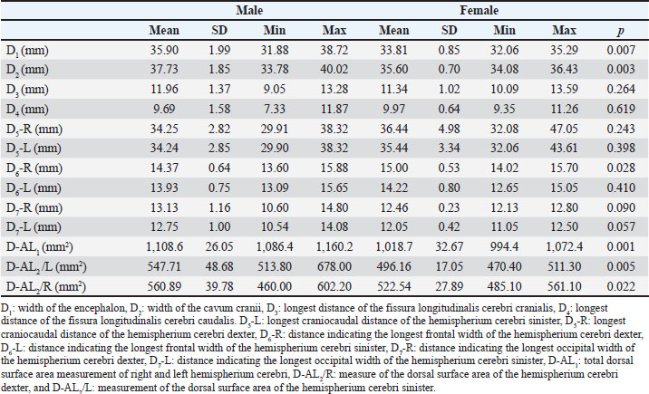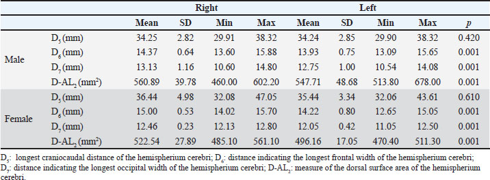 Dorsal measurement findingsTo evaluate whether the dorsal measurements of the encephalon differ according to sex, parameters such as the encephalon, the width, cavum cranii width, and fissura longitudinalis cranialis and caudalis length were analyzed. The widths and craniocaudal lengths of both hemispheres were examined to examine the anatomical brain asymmetry in Van cats. The regional frontal and occipital widths and dorsal surface areas of both hemispheres were measured and evaluated. In this context, the mean widths of the encephalon and cavum cranii of male Van cats were determined as 35.90 and 37.73 mm, respectively, while these values were determined as 33.81 and 35.60 mm, respectively, in female Van cats (Table 2). Table 2. The mean values and SD of the of the dorsal MRI measurement parameters in Van cats according to sex.