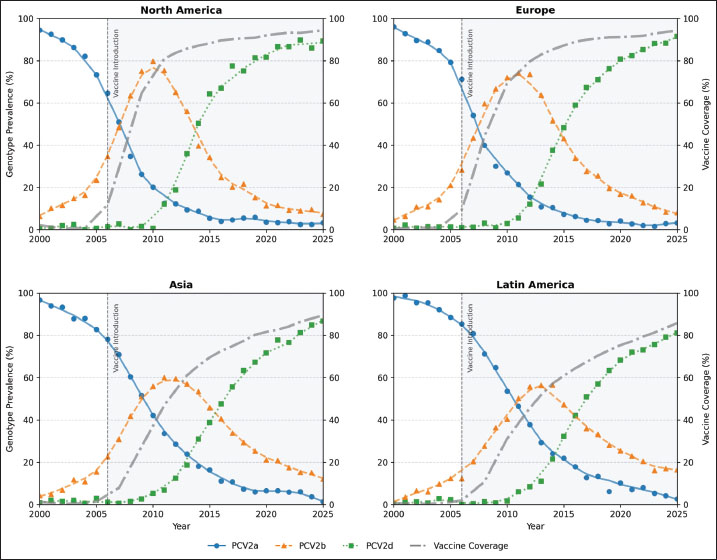 Fig. 1. Regional time series of PCV2 genotype prevalence and vaccine coverage, 2000–2025. Multipanel line plots depict annual prevalence trends of PCV2a (blue solid), PCV2b (orange dashed), and PCV2d (green dotted) in major swine-producing regions, overlaid with vaccine coverage (gray dash-dot, right y-axis). Markers indicate the observed raw values. The vertical shaded band indicates the period following the introduction of the commercial vaccine (2006 onward), facilitating comparison of genotype dynamics before and after vaccine rollout. The pattern becomes even clearer when the data are pooled at the global level (Fig. 2; Table S1). PCV2a prevalence fell from 67.4% in 2006 to just 8.2% by 2020, while PCV2d climbed from under 1% to 58.9% over the same interval. Spearman’s rank correlations reinforce this inverse relationship: vaccine coverage correlates strongly and negatively with PCV2a (ρ=–0.72, p < 0.001) and PCV2b (ρ=–0.41, p < 0.001), yet shows a positive link with PCV2d (ρ=0.23, p < 0.001; Table 1).