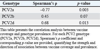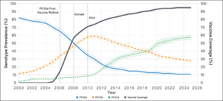 Fig. 2. Global TRENDS in PCV2 genotype prevalence and vaccine coverage from 2000 to 2025. Aggregated global line plots illustrate LOESS-smoothed trends in PCV2a, PCV2b, and PCV2d genotype prevalence, each with 95% confidence ribbons. The thick gray line represents the global mean vaccine coverage. Vertical ticks mark key years of commercial PCV2a vaccine licensing, contextualizing prevalence changes. These trends demonstrate global genotype replacement following the introduction of vaccines. Table 1. Spearman’s rank correlation between PCV2 vaccine coverage and genotype prevalence.