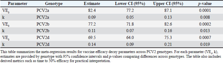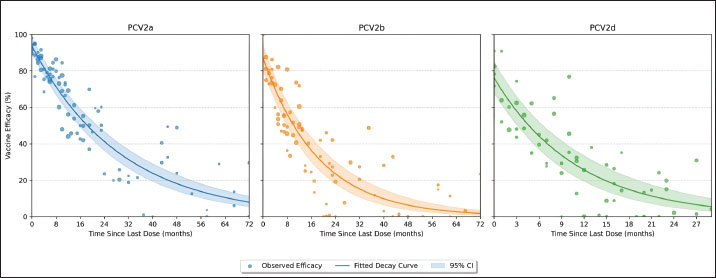 Fig. 3. Exponential decay of the efficacy of the PCV2 vaccine over time by genotype. Scatterplots show individual study estimates of vaccine efficacy (% reduction in clinical disease) plotted by months since the last dose. Exponential decay curves are fitted for each genotype (PCV2a: blue, PCV2b: orange, PCV2d: green), with shaded ribbons indicating 95% confidence intervals. Differences in the initial efficacy and rate of waning between genotypes are visually highlighted, providing insight into the duration of protection. Incorporating genotype as a moderator in the meta-regression confirmed that these differences—both in starting efficacy and in decay rates—are highly significant (p < 0.001). Translating these parameters into practical terms, the time required for vaccine efficacy to diminish by half differs substantially: approximately 18.2, 11.0, and 7.5 months for PCV2a, PCV2b, and PCV2d, respectively (Table 3). Such distinctions underscore the need to consider genotype-specific persistence when designing and scheduling booster regimens. Table 3. Meta-regression of exponential decay parameters for PCV2 vaccine efficacy by genotype.
