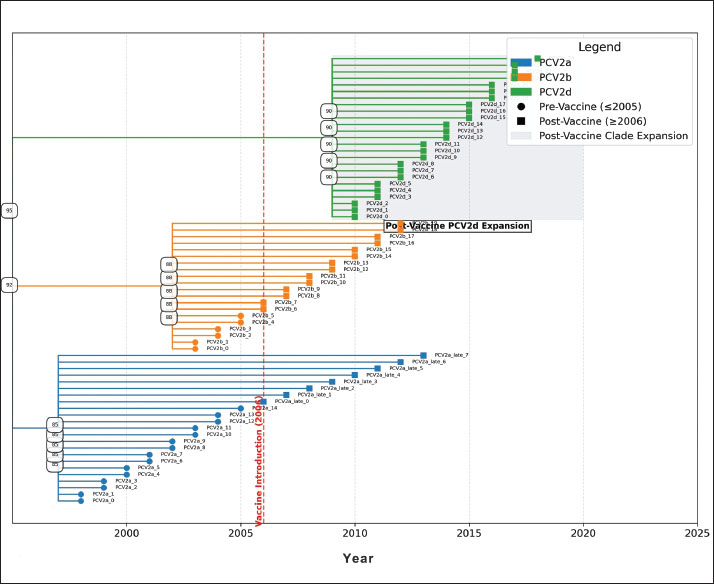 Molecular evolution of the capsidA time-calibrated phylogeny of the PCV2 capsid gene (Fig. 4) illustrates how the virus diversified before and after the vaccine rollout in 2006. Three well-supported clades emerge, each corresponding to one of the major genotypes (PCV2a, PCV2b, and PCV2d). Notably, the PCV2d lineage undergoes a pronounced expansion in the post-vaccine era, forming a dense cluster of sequences sampled after 2006. Bootstrap values exceed 90% at the basal nodes of each genotype clade, confirming that these groupings are statistically robust and biologically meaningful.