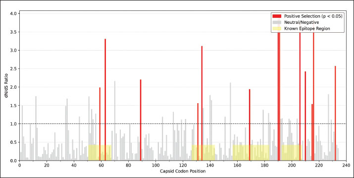 Fig. 5. Codon-level dN/dS ratios for PCV2 capsid with positively selected and epitope sites. A bar chart shows codon-specific dN/dS ratios along the PCV2 capsid protein. The red bars indicate sites under significant positive selection (p < 0.05), and the gray bars indicate sites under neutral or negative selection. The dashed horizontal line at dN/dS=1 demarcates the positive selection threshold. The yellow-shaded regions mark known conformational and linear epitopes, illustrating the overlap between selected sites and antigenic determinants relevant for vaccine escape. DiscussionThis study offers the first unified, cross-temporal examination of how PCV2 vaccination campaigns shape genotype turnover and viral adaptation. The pronounced inverse relationship between vaccine uptake and PCV2a prevalence, together with the concurrent rise of PCV2d (Figs. 1 and 2), supports a vaccine-driven replacement framework. By deploying mixed-effects models that account for both calendar year and regional clustering, vaccination intensity exerts an independent influence on genotype frequencies above and beyond secular trends. Meta-regression of efficacy data provides a mechanistic explanation for these shifts (Fig. 3). Vaccines based on PCV2a antigens confer higher initial protection and wane more slowly than those faced with PCV2d challenges. Consequently, PCV2d finds ecological opportunity: a lower starting efficacy coupled with more rapid decay leaves vaccinated populations vulnerable to this emergent genotype. Field reports of PCV2d detection in herds with minimal clinical signs (Opriessnig et al., 2017, 2020) mirror these model-based predictions. Genotype replacement in PCV2 is believed to be driven by a combination of immune selection pressure and the intrinsic evolutionary capacity of the virus. Widespread vaccination, especially with PCV2a-based formulations, generates strong population-level immunity by targeting epitopes characteristic of the PCV2a capsid. As a result, viral variants possessing amino acid substitutions in key surface-exposed epitopes may evade antibody recognition, gaining a selective advantage in vaccinated populations. Some of the positively selected residues identified here, such as R59K and A131T, can alter antibody binding sites and reduce the neutralization efficacy of vaccine-induced sera without significantly compromising viral replication or transmissibility (Huan et al., 2018). The ability of PCV2 to maintain high fitness and transmission, even with substantial capsid variation, facilitates genotype replacement. The PCV2 genome’s compactness may limit the number of viable escape pathways, favoring occasional but impactful sweeps by novel genotypes rather than gradual antigenic drift. Furthermore, ongoing viral circulation in subclinically infected, vaccinated animals creates reservoirs for the emergence of new variants, amplifying the pace of genotype turnover under vaccine pressure (Huan et al., 2018). Molecular phylogenetics and selection mapping provide direct evidence of adaptive pressure. The post-2006 expansion of the PCV2d lineage in the time-scaled phylogeny (Fig. 4) coincides with the vaccine rollout, and the positively selected capsid codons cluster within known neutralizing epitopes at residues 59, 63, 131, and 191 (Table 4 and Fig. 5). These hotspots—located on solvent-exposed loops—highlight how antibody-mediated immunity can shape viral surface proteins, favoring mutations that reduce neutralization without compromising viral fitness. Table 4. Capsid codons under significant positive selection in the post-vaccine era.
