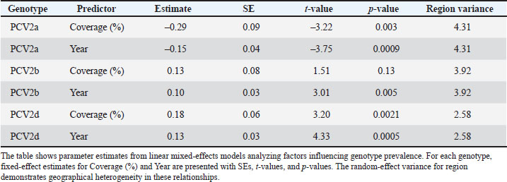 Mixed-effects modeling confirms that these associations are not simply calendar time artifacts (Table 2). After accounting for secular trends, each 10% increase in coverage predicts a 6.3% drop in PCV2a prevalence (β=–0.63, p < 0.001). In contrast, PCV2d prevalence rises with greater vaccine uptake (β=0.18, p < 0.001) and as the years progress (β=1.75, p < 0.001). Together, these results suggest that PCV2d expansion represents a genuine vaccine-era phenomenon rather than a mere background drift. Table 2. Linear mixed-effects model estimates for the impact of vaccine coverage and calendar year on PCV2 genotype prevalence.