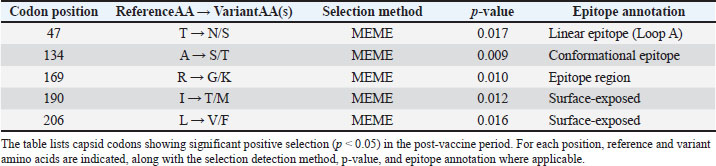 Although PCV2 is a DNA virus that is typically associated with lower mutation rates, its evolutionary dynamics resemble antigenic drift phenomena more commonly seen in RNA viruses such as influenza (Firth et al., 2009). PCV2 exhibits discrete genotype replacements rather than a gradual accumulation of point changes, possibly reflecting the structural constraints imposed by its compact genome and capsid architecture. Other biological factors may also contribute to genotype succession. Differences in replication kinetics, tissue tropism, or environmental stability among genotypes could influence transmission dynamics in field conditions. For example, the rise of PCV2d in several regions has been associated with more efficient vertical and horizontal transmission compared with earlier genotypes (Franzo and Segalés, 2018). Changes in host factors, including genetic diversity and immunological background, may further shape the landscape of selection and drive PCV2 adaptation in global swine populations (Bandrick et al., 2022). Several practical lessons have emerged. First, the marked differences in the time to 50% vaccine efficacy—18.2 months for PCV2a versus 7.5 months for PCV2d—suggest that booster intervals optimized for the ancestral genotype may underestimate the needs imposed by emergent strains. Second, the selection concentration at specific epitope sites identifies clear targets for next-generation formulations. Early trials of bivalent vaccines incorporating PCV2d antigens have already demonstrated enhanced cross-genotype protection, with vaccinated animals exhibiting significantly reduced viremia and improved clinical outcomes following challenge with both PCV2a and PCV2d strains (Bandrick et al., 2022). Limitations warrant acknowledgment. Heterogeneity in surveillance intensity and efficacy study designs could introduce bias, and coverage estimates from industry sources may overstate real-world uptake in smallholder settings. Moreover, selection analyses focused solely on the capsid gene, leaving open the question of adaptive changes elsewhere in the genome. Coordinated, prospective surveillance in sentinel herds—coupled with whole-genome sequencing and targeted challenge studies—will be critical to validate the role of identified mutations in immune escape. Mathematical models that integrate these empirical decay rates and selection coefficients could forecast future genotype dynamics and refine vaccination schedules. Ultimately, an iterative approach combining updated vaccine compositions and real-time evolutionary monitoring will be essential to sustain long-term control of PCV2. ConclusionOver the past 20 years, the widespread implementation of PCV2a-based vaccines has not only reduced the disease burden but also steered the evolutionary course of PCV2 populations. Epidemiological trends document successive genotype replacements, efficacy-decay analyses reveal shorter protective windows against newer strains, and codon-level selection highlights antigenic sites under vaccine-induced pressure. Together, these strands of evidence paint a cohesive portrait of vaccine-driven adaptation, where variants carrying epitope-altering mutations gain a fitness advantage in vaccinated herds. Despite the sustained ability of current vaccines to prevent overt clinical disease, the accelerated waning of protection and the emergence of escape-associated mutations underscore the urgency of refining vaccine composition. Incorporating PCV2d antigens—or designing chimeric capsid constructs that encompass key neutralizing epitopes from multiple genotypes—could broaden and prolong immunity. Such next-generation formulations will be critical to preempt further genotype-driven rebounds. Finally, this study exemplifies how integrating spatio-temporal surveillance, rigorous efficacy modeling, and molecular evolution analyses can illuminate the feedback loop between vaccination and viral change. Applying this framework to PCV2 makes it possible to forecast evolutionary trajectories and proactively tailor immunization strategies, ensuring that vaccine design keeps pace with pathogen adaptation. AcknowledgmentsThe author would like to thank the DOST S&T Fellows Program, the Philippine Council for Agriculture, Aquatic, and Natural Resources Research and Development (DOST-PCAARRD) for funding this research project, and the Industrial Technology Development Institute (DOST-ITDI) for hosting this research project. Conflict of interestThe authors declare no conflicts of interest. FundingThe Philippine Council for Agriculture, Aquatic, and Natural Resources Research and Development (DOST-PCAARRD) funded this study. Data availabilitySupplementary Tables S1-S4 will be available upon reasonable request from the author. ReferencesAfghah, Z., Webb, B., Meng, X.J. and Ramamoorthy, S. 2017. Ten years of PCV2 vaccines and vaccination: is eradication a possibility? Vet. Microbiol. 206, 21–28; doi:10.1016/j.vetmic.2016.10.002 Bandrick, M., Balasch, M., Heinz, A., Taylor, L., King, V., Toepfer, J. and Foss, D. 2022. A bivalent porcine circovirus type 2 (PCV2), PCV2a-PCV2b, vaccine offers biologically superior protection compared to monovalent PCV2 vaccines. Vet. Res. 53, 12; doi:10.1186/s13567-022-01029-w Bates, D., Mächler, M., Bolker, B. and Walker, S. 2014. Fitting linear mixed-effects models using lme4 [Remark 1]. ArXiv E-Prints arXiv:1406; doi:10.18637/jss.v067.i01 Cybulski, P., Woźniak, A., Podgórska, K. and Stadejek, T. 2020. Vaccination of sows against PCV2 in a subclinically infected herd does not impact reproductive performance. Agriculture 10, 639; doi:10.3390/agriculture10120639 Fajardo, L.E., Banico, E.C., Sira, E.M., Odchimar, N.M.O. and Orosco, F.L. 2025. Computational multi-epitope based design of a multivalent subunit vaccine against co-infecting African swine fever virus and porcine circovirus type 2. Vet. Integr. Sci. 23(1), 1–30; doi:10.12982/VIS.2025.065 Firth, C., Charleston, M.A., 