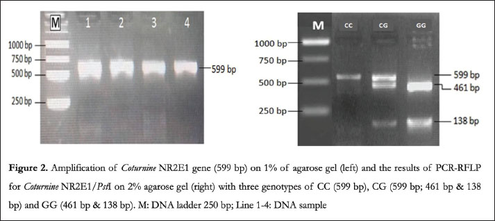 Fig. 2. Amplification of Coturnine NR2E1 gene (599 bp) on 1% agarose gel (left) and PCR-RFLP results for CC gene NR2E1/PstI on 2% agarose gel (right) with three genotypes of CC (599 bp), CG (599 bp; 461 bp & 138 bp), and GG (461 bp & 138 bp). M: DNA ladder 250 bp; Line 1–4: DNA sample.