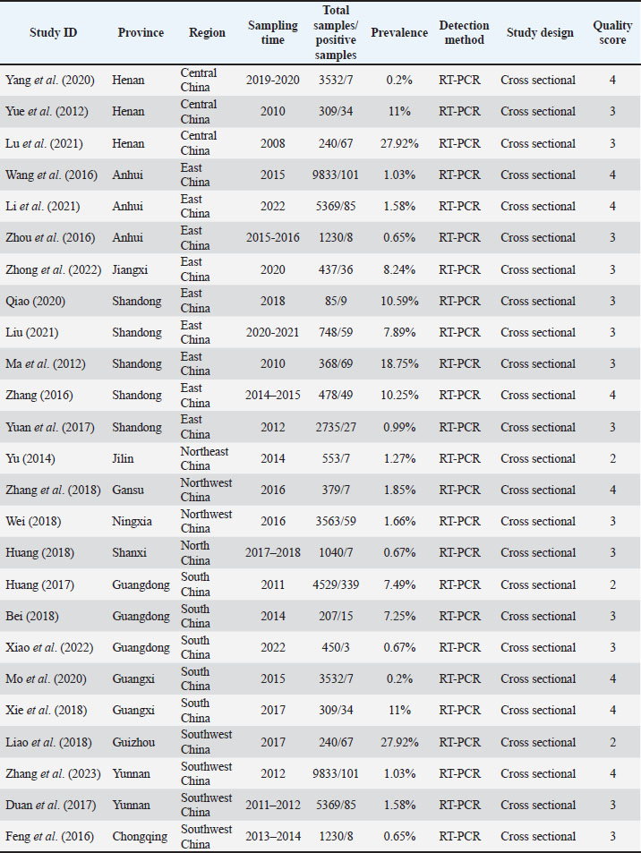 Fig. 1. PRISMA flow diagram of the literature search, screening, assessing for eligibility, and selecting articles for the meta-analysis. Inclusion and exclusion criteriaInclusion criteria: -Extractable prevalence data (within/between flocks) -Spatiotemporal sampling details -Inclusion of backyard flocks (<30 birds/unit). Studies were excluded from this analysis if they met any of the following criteria: studies with sample sizes < 30 poultry, studies conducted outside of China, studies unrelated to avian research, non-research publications (newsletters, press releases, and forums), basic research focused on NDV, non-epidemiological studies, studies without information pertaining to sample size, sampling time, prevalence, or rates of NDV infection, and studies based solely on questionnaires without any researcher-implemented analyses. Data retrievalData were extracted from selected studies into structured tables, including study characteristics (Table 1) and NDV prevalence details (region, sample type, diagnostic method, etc.; Table 2). Table 1. Included studies focused on NDV-infected poultry in mainland China.
