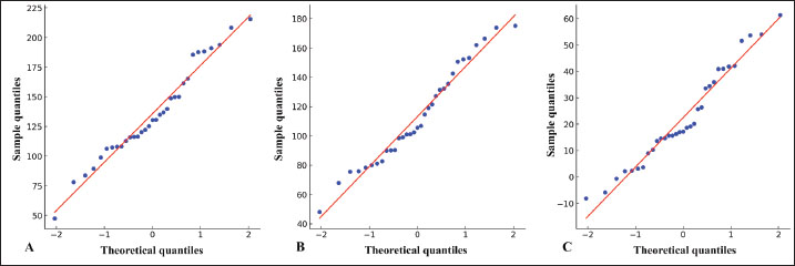 Fig. 3. Quantile-Quantile (Q-Q) plots for normality assessment. (A) Phenobarbital concentrations measured using the point-of-care analyzer. (B) Phenobarbital concentrations measured using the reference laboratory analyzer. (C) Differences in phenobarbital measurements between the two analyzers. In all three plots, the data points (blue dots) are compared with a theoretical normal distribution (red line). The linear distribution of points along the red line indicates approximate normality (supported by the results of the Shapiro-Wilk tests).