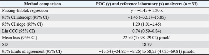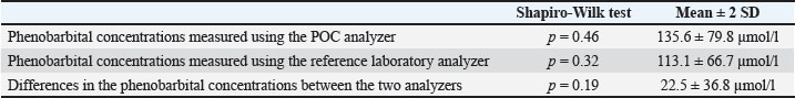 Fig. 2. Passing–Bablok regression analysis comparing plasma phenobarbital concentrations obtained using the point-of-care (POC) and reference laboratory analyzers. The solid red line represents the regression line, and the dashed black line represents the line of identity. Grey lines indicate the 95% confidence intervals for the slope and intercept. Table 2. Assessment of normality and descriptive statistics (mean ± 2 SD) for plasma phenobarbital concentrations measured by both analyzers, and for phenobarbital concentrations differences between analyzers.