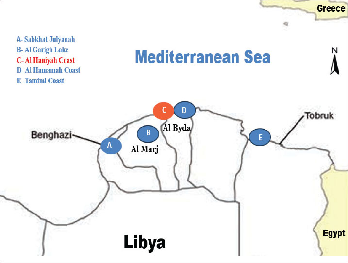 Fig. 1. A map showing the names of the wetlands and lakes in some areas of eastern Libya from which samples were taken: (A) Benghazi (Sabkhat Julyanah), (B) Al Marj (Al Garigh Lake), (C) Al Bayda (AL Haniyah Coast), (D) Al Bayda (Al Hamamah Coast), and (E) Tobruk (Al Tamimi Coast). Table 1. Types of wild migratory birds and wetland areas.