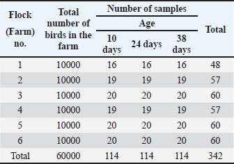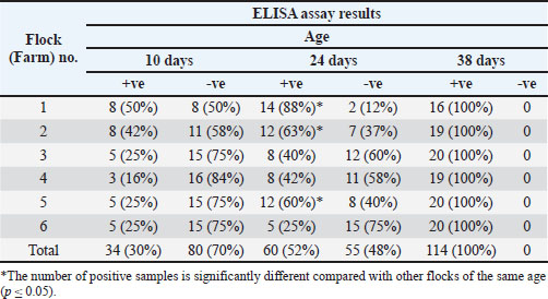 Serological assaysIndirect ELISA to detect antibodies against avian influenza type A was used for the analysis of sera at the NCAH in Tripoli, Libya. The ELISA was conducted according to the manufacturer’s (X-OvO Limited, United Kingdom) instructions. An ELx800 ELISA reader with a 550 nm filter (BIO-TEK Instruments, Inc., Winooski, VT, USA) was used. The sera were also tested for AIV serotype H9N2 using HI test. HA and HI were performed according to the procedure described by the OIE (2009) using 96 “V-shaped” well microtiter plates, 1% v/v blood cells (RBCs), and 4 HA units of AIV H9N2 antigen (OIE, 2009). Statistical analysisData were managed and analyzed using SPSS, version 27.0 (SPSS Inc., Chicago, IL, USA). Analysis was performed using the chi-square test. Statistical significance was designated for differences with p-values less than or equal to 0.05. Ethical approvalAll samples were collected according to local and international standards for the care and use of research animals. ResultsClinical signs and postmortem findingsBroiler flocks included in this study showed mild to moderate respiratory symptoms. The most frequent observations were sneezing, nasal discharge, and mild breathing difficulty. No lesions that could be attributed to a specific respiratory disease were found on postmortem examination. The findings suggest that the signs were nonspecific and could have been influenced by other infections or management-related factors. ELISA assay for influenza A antibodiesSerum samples from six broiler flocks were tested by indirect ELISA at 10, 24, and 38 days of age (Table 3).
