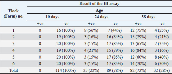 These results confirm that the influenza A virus is circulating in broiler flocks in the study area and that the antibody levels progressively increase as the birds get older. HI assay for H9N2 antibodiesELISA-positive samples were further examined for H9N2-specific antibodies using the HI test (Table 4).