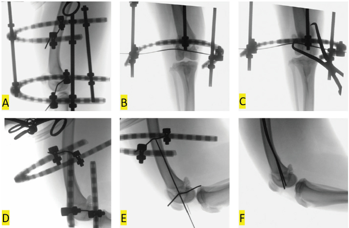 Fig. 3. Intra-operative fluoroscopic images of indirect closed fracture reduction and fluoroscopic assisted percutaneous pinning. The fixator was applied to distract the femur through the fracture site (A, B). A point-to-point reduction forceps was placed in an attempt to obtain anatomic reduction, but reduction was still suboptimal (C). The connecting rods were removed and the ring secured to the distal fixation wire and used as a traction bow to apply a varus through the fracture as the stifle was flexed and a proximal force was applied to the tibia (D). A needle was used to locate an insertion site on the lateral femoral condyle and the first of two Steinmann pins were placed in Rush fashion (E). After placement the Steinmann pins were trimmed and counter sunk (F). The use of intra-operative fluoroscopic imaging was integral to obtaining and confirming acceptable closed reduction and implant placement. Fluoroscopic assisted percutaneous pinning is a form of minimally invasive fracture repair involving closed reduction and placement of interfragmentary Kirschner wires or Steinmann pins inserted through small insertional incisions (Kim et al., 2012; Boekhout-Ta et al., 2017). We initially placed a hypodermic needle through the soft tissues cranial to the lateral femoral condyle to confirm, via fluoroscopy, the appropriate location for inserting our first Steinmann pin. Fluoroscopic assisted percutaneous pinning confers several advantageous benefits compared to traditional open techniques, including limited iatrogenic soft tissues trauma and less disruption to the peri-osseous circulation (Kreder et al., 2005; Boekhout-Ta et al., 2017). We cut and then counter sunk the Steinmann pins through the pin insertional incisions which eliminated soft tissue irritation. The pin placed in the lateral femoral condyle was noted to protrude slightly beyond the subchondral bone on the 1- and 9-months post-operative radiographs. This pin did not appear to have migrated and there were no clinical or radiographic abnormalities suggesting that the pin was problematic. In a retrospective study assessing the clinical results of fluoroscopic-assisted percutaneous pinning of 42 physeal fractures in dogs and cats, Boekhout-Ta et al. (2017) reported elective pin removal was performed in 41% of cases. Management of the trimmed end of the pins was variable and was not described for individual cases, but surprisingly, the manner in which the end of the pins was managed was not found to be a significant predictor of pin removal or outcome (Boekhout-Ta et al., 2017). We would suggest that countersinking pins after the pins have been trimmed would cause less post-operative morbidity compared to leaving the pin protruding, even if bent, through the cartilage surface. Transient intra-operative application of the circular construct to distract the fracture segments facilitated successful indirect closed reduction of this dog’s distal femur physeal fracture. Fluoroscopic-assisted percutaneous placement of Steinmann pins in Rush fashion resulted in a successful outcome. Closed reduction of fractures purportedly mitigates post-operative pain, leading to faster recoveries with decreased infection rates (Cook et al., 1999; Kreder et al., 2005; Boekhout-Ta et al., 2017). When the owner was contacted 2 days after discharge, the dog was already placing substantial weight on the right pelvic limb. The dog was not appreciably lame nor was discomfort elicited on manipulation of the right stifle 5 weeks following surgery. The owner of the dog was solicited to bring the dog back 9 months after surgery for a mid-term evaluation (Cook et al., 2010). The owner was very satisfied with the outcome and there was no lameness or discomfort noted on examination. Thigh circumference as well as flexion and extension of the stifles was comparable between pelvic limbs and, based on the results of the force plate analysis, the dog was surprisingly bearing more weight on the previously operated, right pelvic limb compared to the unoperated, left pelvic limb. The post-operative functional results in the dog in the current report corroborate results reported in a study of human patients with articular distal radius fractures managed with indirect reduction and percutaneous fixation who had an earlier return to function compared to patients managed with open reduction and internal fixation: patients treated by indirect reduction and percutaneous fixation also had superior long-term functional outcomes (Kreder et al., 2005). Conflict of interestThe corresponding author teaches continuing education courses for IMEX Veterinary Inc. The other authors have no conflict of interest to declare relative to the work presented here. ReferencesAnderson, G.M., Lewis, D.D., Radasch, R.M., Marcellin-Little, D.J., Degna, M.T. and Cross, A.R. 2003. Circular external skeletal fixation stabilization of antebrachial and crural fractures in 25 dogs. J. Am. Anim. Hosp. Assoc. 39, 479–498. Baroncelli, A.B., Peirone, B., Winter, M.D., Reese, D.J. and Pozzi, A. 2012. Retrospective comparison between minimally invasive plate osteosynthesis and open plating for tibial fractures in dogs. Vet. Comp. Orthop. Traumatol. 5, 410–417. Boekhout-Ta, C.L., Kim, S.E., Cross, A.R., Pozzi, A. and Evans, R. 2017. Closed reduction and fluoroscopic assisted percutaneous pinning of 42 physeal fractures in 37 dogs and 4 cats. Vet. Surg. 46, 103–110. Bone, L.B. 1994. Indirect fracture reduction: a technique for minimizing surgical trauma. J. Am. Acad. Orthop. Surg. 2, 247–254. Cook, J.L., Evans, R., Conzemius, M.G., Lascelles, B.D., McIlwraith, C.W., Pozzi, A., Clegg, P., Innes, J., Schulz, K., Houlton, J., Fortier, L., Cross, A.R., Hayashi, K., Kapatkin, A., Brown, D.C. and Stewart, A. 2010. Proposed definitions and criteria for reporting time frame, outcome, and complications for clinical orthopedic studies in veterinary medicine. Vet. Surg. 39(8), 905–908. Cook, J.L., Tomlinson, J