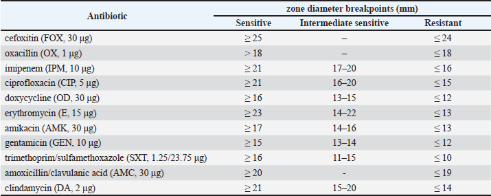 ABSTRACTBackground: The microbiota of the external ear of cats comprises different types of bacteria that can change due to intrinsic or extrinsic factors. Coagulase-negative Staphylococcus (CoNS) is predominant in the external ear of cats. Antibiotic-resistant CoNS associated with infectious pathologies has been reported in humans. The presence of antibiotic-resistant CoNS acting as reservoirs in the ears of healthy cats could represent a zoonotic risk. This has not yet been studied in Talca, Chile. Aim: This study aimed to determine the antimicrobial susceptibility of CoNS strains obtained from the external ear of healthy cats in Talca, Chile, as a possible zoonotic risk. Methods: Ear swabs were obtained from 31 healthy cats. Bacterial culture and morphological analysis were performed on the samples. MALDI-TOF was used to identify CoNS strains, which were tested against a panel of 11 antibiotics using the Kirby-Bauer disk diffusion method. Fisher’s exact test was used to determine the association between the epidemiological variables of the patients and the antimicrobial susceptibility of CoNS strains. Results: Nine CoNS strains were isolated from the ear of seven healthy cats (prevalence 22.58%). Staphylococcus simulans and Staphylococcus felis were the main species identified. Antimicrobial resistance was observed in 55.5% of the strains, mainly to oxacillin. Resistance to more than two antibiotics was observed in 22.2% of the strains. No association was found between the epidemiological variables of the patients and the antimicrobial susceptibility of the CoNS strains. Conclusion: The ears of healthy cats can act as a reservoir for antibiotic-resistant CoNS, with a potential risk of transmission to humans. These preliminary results are the first to be reported in Talca, Chile. Keywords: Staphylococcus, Healthy cat, Ear, Antimicrobial resistance. IntroductionStaphylococcus spp. is a diverse genus of facultative anaerobic Gram-positive bacteria comprising more than 40 different species. These bacteria are commensals of the skin and mucous membranes in humans and animals and can cause serious infections in different tissues (Morris et al., 2017). Coagulase-positive Staphylococcus species are described as the agents most associated with infections in both animals and humans, whereas coagulase-negative Staphylococcus (CoNS) is reported as part of the skin and mucosal microbiota (Weese, 2013; Becker et al., 2014; Possa de Menezes et al., 2025). However, the CoNS group has currently been described as having an important clinical relevance due to its virulence and pathogenicity factors (Elnageh et al., 2021; Sukur and Esendal 2020; Franca et al., 2021). CoNS have been associated with serious infections in humans, mainly as opportunistic agents in immunocompromised patients (Asante et al., 2020) and as nosocomial pathogens associated with the use of invasive medical devices (Becker et al., 2014). In cats, they are part of the skin and ear microbiota and have been described in lower urinary tract infections, eye infections, and otitis (Litster et al., 2007; Loeffler et al., 2011; Nocera et al., 2021), with Staphylococcus felis, Staphylococcus simulans, and Staphylococcus schleiferi being the most described species (Ma et al., 2020). Currently, these species constitute a therapeutic challenge (Becker et al., 2014), as methicillin-resistant isolates and others with resistance to more than two antimicrobials have been reported (Hiramatsu et al., 2001; Suepaul et al., 2021; Miszczak et al., 2023; Temmerman et al., 2024). This study aimed to determine the antimicrobial susceptibility of CoNS strains obtained from the external ear canal of healthy cats. Materials and MethodsFrom December 2021 to March 2022, a total of 31 healthy cats were sampled and attended for routine check-ups in the city of Talca, Chile (35°26′00”S; 71°40′00”W), who underwent a history and physical examination under the management of “cat friendly” care, recording epidemiological variables and variables of clinical interest, such as: age (kitten=birth up to 1 year; young adult=1–6 years; mature adult=7–10 years; senior > 10 years) (Quimby et al., 2021); sex (male or female); reproductive status (whole; sterilized); breed Domestic Short Haired (DSH); Domestic Long Haired (DLH); confinement (indoor or outdoor); having been hospitalized at some point in life (yes or not); has received antibiotic treatment at some point in life (yes or not). Exclusion criteriaCats with the following clinical records were excluded from this study: cats with clinical otitis; cats that have been hospitalized in the last 30 days prior to sampling; cats that have received antibiotic treatment in the last 30 days prior to sampling. SamplingSamples were taken from the right external auditory canal (Older et al., 2021) using a sterile swab in Stuart transport medium (Linsan, Santiago, Chile) and transported immediately to the Clinical Microbiology Laboratory of the Andrés Bello University, Metropolitan Region. Sample processingEach swab was seeded on mannitol salt agar (Becton Dickinson, Heidelberg, Germany) and incubated at 37°C for 24 hours. Then, the different cultured morphotypes were evaluated semi-quantitatively. Gram-positive, catalase-positive, and coagulase-negative morphotypes (BD BBL™) they were isolated in blood agar (Linsan, Santiago, Chile) and subsequently identified by MALDI-TOF mass spectrometry (Maldi Biotyper, Bruker, Billerica, MA, USA) (Oliveira et al., 2021). All CoNS isolates were tested against a panel of 11 antibiotics using the Kirby-Bauer disk diffusion method following the CLSI guidelines in document VET01S (CLSI, 2020). The antibiotics tested included cefoxitin (FOX, 30 μg), oxacillin (OX, 1 μg), imipenem (IPM, 10 μg), ciprofloxacin (CIP, 5 μg), doxycycline (OD, 30 μg), erythromycin (E, 15 μg), amikacin (AMK, 30 μg), gentamicin (GEN, 10 μg), trimethoprim/sulfamethoxazole (SXT, 1.25/23.75 μg), a