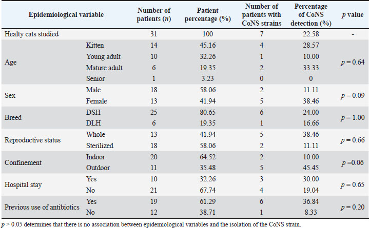 Statistical analysisDescriptive statistics were used to characterize the distribution of the isolated strains and their antimicrobial susceptibility. The association between the epidemiological variables of the patients and the antimicrobial susceptibility of the Staphylococcus strainswas determined using the exact Fisher test, with 95% confidence and a α error of 5% (Di Rienzo et al., 2008). Ethical approvalThe study received the approval of the Scientific Ethics Committee of the South Central Macrozone of the Santo Tomás University (CEC-CS UST), code n°129-21. ResultsOf the 31 healthy cats studied, CoNS was detected in seven of them (prevalence 22.58%). The most frequent variables were: age kitten (45.16%), male sex (58.06%), breed DSH (80.65%), reproductive status (sterilized) (58.06%), and confinement indoor (64.52%). On the other hand, 67.64% of cats have not been hospitalized, and 61.29% have received antibiotic treatment at some point in their lives (Table 2). No association was found between epidemiological variables and Staphylococcus isolation (p > 0.05). Table 2. Absolute (n) and relative (%) frequency distribution of the epidemiological variables and detection of strains CoNS in the 31 patients included in the study.