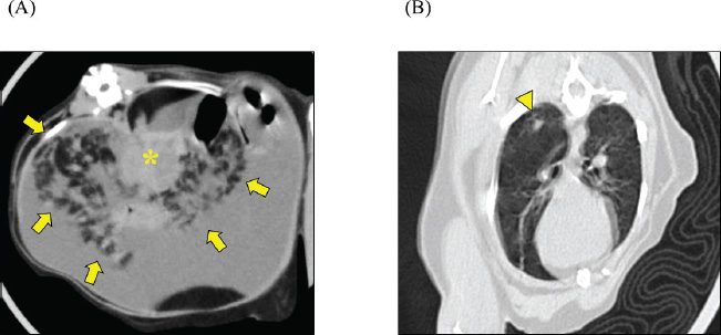 Fig. 1. Abdominal radiographs. (A) Right lateral and (B) ventrodorsal radiographs are shown. The images show severe abdominal distension and a generalized decrease in contrast, suggesting ascites. Mild gas retention and clustering of the intestines were observed (arrow).