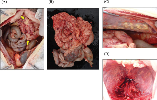 Fig. 5. Gross findings at autopsy. (A) The irregularly thickened peritoneum (omentum, lesser omentum, and mesentery) formed a mass in the upper abdomen. Small amounts of fibrin deposition were observed on the serosal surfaces of the abdominal organs (arrow). (B) The upper small intestine was covered by an irregularly thickened peritoneum, resulting in a loss of mobility. Multiple white to yellowish-white nodules, measuring 3−5 mm, were observed on the (C) left abdominal wall and (D) the ventral surface of the diaphragm. DiscussionExocrine pancreatic adenocarcinoma of ductular or acinar origin is very rare and more commonly reported in older cats aged ≥10 years (Linderman et al., 2013; Cony et al., 2023). The patient in the current case, at only 2 years and 7 months of age, was relatively young. Reports on undifferentiated carcinoma of the pancreas in cats younger than 1 year (Cony et al., 2023) and neuroendocrine carcinoma in cats aged 2 years and 11 months (Michishita et al., 2017) had been documented previously. Therefore, significant pancreatic enlargement warrants the consideration of malignant tumors as a differential diagnosis, even in younger cats. Feline pancreatic cancer typically demonstrates high metastatic potential, with a median survival time of approximately 3 months (Linderman et al., 2013; Rosario et al., 2023). The presence of ascites has been reported as a poor prognostic factor. In the present case, severe ascites were observed, and the survival time after presentation was short (19 days). While showing histological features of pancreatic ductal adenocarcinoma, the relatively low expression of cytokeratins 7 and 20, which are immunohistochemical markers of this type of cancer (Cony et al., 2023), suggested a lower degree of differentiation; the latter could contribute to its strong invasive and metastatic potential. Some cases of feline pancreatic cancer have been reported to show prolonged survival after surgical intervention, chemotherapy, and targeted molecular therapy (Linderman et al., 2013; Rosario et al., 2023). This case was advanced, making antemortem diagnosis and therapeutic intervention difficult. Further research is warranted to establish non-invasive diagnostic techniques for the early detection of pancreatic cancer in cats. In previous reports, cancerous peritonitis mimicking EPS was documented in a feline case of carcinoma of unknown origin and in both a cat and a dog with pancreatic adenocarcinoma (Tsukada et al., 2022; Nam et al., 2023; Kim et al., 2024). The clinical and histopathological features in the previously reported cases closely resembled those of the present case; however, as the cats were 9 and 13 years old, the current case represents the youngest reported case to date with similar characteristics. In human medicine, the most common etiology of EPS is long-term, repetitive peritoneal dialysis, with chronic inflammation recognized as the primary underlying mechanism (Danford et al., 2018). In contrast, rapidly progressive malignant neoplasms are not typically regarded as a causative factor for EPS. Therefore, while such cases may fall within the broader spectrum of EPS, it remains controversial whether peritoneal encapsulation secondary to peritoneal carcinomatosis should be classified as true EPS. This uncertainty persists even when imaging demonstrates encapsulation of abdominal organs by markedly thickened peritoneum, and pronounced peritoneal fibrosis is revealed by histopathology. The molecular mechanisms underlying fibrosis in these pathological conditions remain unclear. In human EPS, fibrotic progression is suggested to involve pathways such as transforming growth factor signaling and α-smooth muscle actin expression (Danford et al., 2018); however, these factors are not specific to EPS and are also implicated in desmoplasia associated with human pancreatic cancer (Merika et al., 2012). Therefore, it is challenging to determine whether the fibrosis observed arises from tumor-associated desmoplasia or from EPS-like mechanisms. A prior pathological review of feline pancreatic tumors noted frequent peritoneal dissemination (Cony et al., 2023), although EPS was not explicitly addressed, raising the possibility that EPS-like conditions may have gone unrecognized. These findings suggest that feline pancreatic adenocarcinoma may exhibit clinical features that closely mimic EPS. Conversely, a canine case of EPS associated with intraperitoneal bleeding caused by hepatocellular carcinoma, without evidence of peritoneal metastasis, has also been reported (Barnes, 2015). Collectively, these observations underscore the necessity of including malignant neoplasia in the differential diagnosis when EPS is suspected in companion animals.