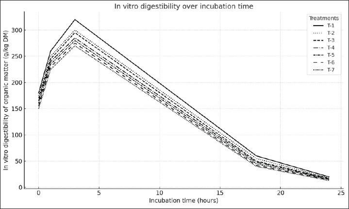 Fig. 3. In vitro digestibility of organic matter (g/kg DM) across incubation times (0–24 hours) for the seven dietary treatments (T-1 to T-7). Each curve represents the digestibility kinetics of a formulated diet containing different inclusion levels of Tithonia diversifolia and Moringa oleifera flours. T-1 (100% basal diet) showed the highest digestibility peak, particularly during the early fermentation phases (1–3 hours). Differences among treatments reflect the influence of fiber and starch content on fermentation dynamics. DiscussionCutting height of Tithonia diversifoliaThe agronomic behavior and forage yield of T. diversifolia show that cutting height determines vegetative development and yield; at 40 cm, a greater plant height, number of shoots, and forage yield were observed in fresh weight and dry matter. This tendency can be explained by the more dormant buds activated at higher cuts, favoring vigorous regeneration, a principle widely recognized in forage shrub species (Canto et al., 2023). Similar studies have shown that cutting management influences not only the amount but also the persistence of regrowth. This aligns with reports by Uu-Espens et al. (2022) and Botero Londoño et al. (2019), who reported higher biomass at optimized planting densities. This complements our findings by demonstrating that crop architecture and cutting height influence yield. According to Angulo-Arizala et al. (2024), the yield obtained, which exceeds 59 t GF/ha per cutting, even under low rainfall conditions, reinforces the forage potential of the species. This is especially relevant in contexts where seasonality limits the biomass supply of traditional grasses. From a nutritional point of view, T-3 not only allowed a higher yield but also a better quality of the harvested forage. Significant increases in CP and Hcell content and reductions in structural fiber fractions (NDF and SDF) were observed. This pattern is desirable; according to Vargas Velazquez et al. (2024) and Putri et al. (2024), a lower proportion of lignified stems leads to higher dry matter digestibility and better nitrogen utilization efficiency. Soares et al. (2024) reported high protein levels in T. diversifolia, especially in the early vegetative stages. In this case, the higher cutting strategy possibly favored a higher leaf/stem ratio, resulting in a leaf fraction richer in nutrients (Andrade Villaroel et al., 2024). Compared with other tropical shrubs, such as Gliricidia septum and Leucaena leucocephala, T. diversifolia shows a promising balance between yield and quality, considering its lower input requirement and higher adaptability (Canul et al., 2018). In pigs, hemicellulose is a source of fermentable fiber that can be partially degraded in the large intestine, contributing secondarily to energy production via short-chain fatty acids (Liu et al., 2022). Although this pathway represents a minor fraction of the total energy intake in monogastric pigs, its presence, combined with a high CP content and low lignin level, favors better digestive efficiency and optimizes the overall utilization of the diet in growing pigs (Hu et al., 2023). Cutting frequency of Tithonia diversifoliaThe lack of statistical differences in DM does not rule out its practical relevance in animal feeding; values above 85% in intermediate and late cuts indicate greater physiological maturity, associated with lower water content and greater conservation as meal or hay; this coincides with studies by Verdecia et al. (2018) and Zamora (2019), who observed increases in DM with age, attributed to progressive lignification. However, these benefits may compromise palatability and digestibility, as indicated by Sampaio and Da Costa (2018), who attributed higher DM levels to reduced soluble nutrients and changes in cellular architecture. Therefore, the balance between water content, ease of storage, and digestive quality is key to agronomic decision-making. In contrast to what has been reported in most studies (Ramírez et al., 2023), where CP tends to decrease with the age of cutting, an increasing trend was observed in this study up to 60 days. This finding demonstrates a favorable soil and climatic environment in the Ecuadorian Amazon, which allows for maintaining a high leaf proportion even in advanced stages of regrowth (Uu-Espens et al., 2023). Protein synthesis remains active due to a leaf pattern dominated by young leaves with high metabolism, which has also been observed in tropical systems by Vivas-Arturo et al. (2022). This poses an optimal scenario for intermediate cuts where yield and nutritional quality are maximized. The decreasing trend in crude fiber is unusual, as maturation generally increases structural components. This exception may be influenced by the management of 50 cm cutting and the high regeneration of T. diversifolia in humid climates, as described by Navas Panadero and Montaña (2019) and Vargas Velázquez et al. (2024). A lower proportion of stem and greater leaf area explain this phenomenon, which is favorable for its inclusion in diets for young ruminants or monogastric, where digestibility is critical. NFD peaked at 55 days (41.2%), suggesting that this is the stage with the highest accumulation of soluble carbohydrates; these components are key to the net energy and fermentative profile of the forage, as highlighted by Kaur et al. (2021) and Getachew et al. (2018); thus, a subsequent decrease in NFD at 60 days indicates that the forage begins to mobilize reserves or invest in structural tissue. The energy estimation peaked at 55 days (ME=276.6 kcal/kg DM), supported by a better combination of CP, NFD, and lower NDF. This result reinforces the intermediate cut approach proposed by Hidalgo L. and Valerio C. (2020) and Noblet et al. (1994), who stress that energy digestibility is an accurate indicator of zootechnical value beyond chemical content. The ME values of T. diversifolia are competitive or superior to those of ot