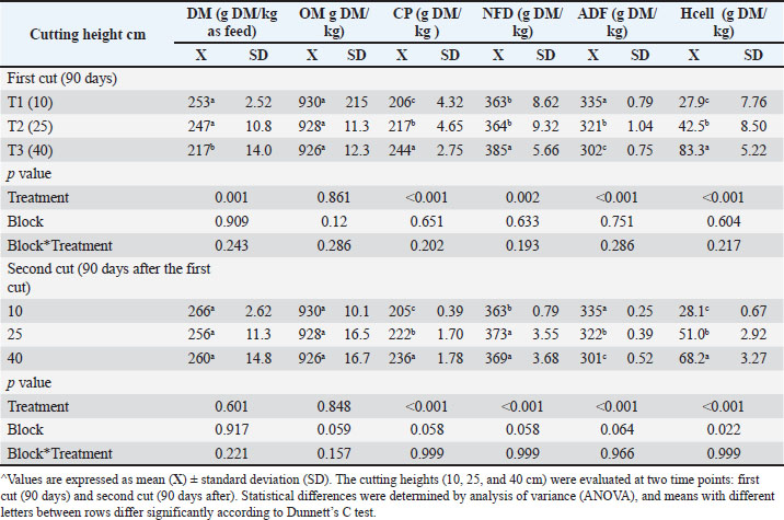 Statistical analysisThe statistical analysis was based on randomized block experimental designs to evaluate the effect of treatments such as cutting heights, sowing densities, and diet inclusion levels. For the comparison of means, ANOVA was applied when the data met the normality and homogeneity of variances assumptions. In cases where these assumptions were not met, as in the cut-off frequency effect analysis, the Kruskal–Wallis test was used, complemented by Dunn’s and Bonferroni’s tests for multiple comparisons. In the in vitro digestibility study of T. diversifolia and M. oleifera meal at different inclusion levels (5%, 10%, and 15%) in pig diets, the GLM was used to evaluate the effect of inclusion on the chemical composition, digestibility, and energy content of the treatments evaluated by the model: Yij=μ + Ti=1-7 + DIj=1-3 + Eij With Ti=1-7, the treatment (one vs. 2 vs. 3 vs. 4 vs. 5 vs. 6 vs. 7); DIj=1-3, the day of incubation (one vs. 2 vs. 3); ε, the experimental error. Dunnett’s C analysis was used to discern differences between treatments. Statistical significance in all studies was generally established at the p < 0.05 level. Data processing was performed using the R statistical package, and the statistical methods were adapted according to compliance with model assumptions. LimitationsThis study presents relevant findings on the agronomic performance, nutritional composition, and in vitro digestibility of Tithonia diversifolia and M. oleifera under Amazonian conditions. However, certain limitations should be acknowledged. Although in vitro digestibility techniques provide reliable estimates of nutrient availability and are widely used in early-stage evaluations, they do not fully replicate the complex physiological responses of live animals. Therefore, the absence of in vivo feeding trials limits the ability to validate the actual effects of the tested diets on animal growth performance, feed conversion, or gut health. In addition, the use of a controlled laboratory setting for digestibility assays may not capture the variability found under commercial or field conditions, including fluctuations in forage palatability, feed intake behavior, and microbiota interactions in monogastric animals. The scope of the study was also limited to a single geographical location and season, which may affect the generalizability of the results to other tropical regions or production systems. Future research should include controlled feeding trials to confirm the effects of T. diversifolia and M. oleifera inclusion on animal performance, as well as studies that explore the interaction of these forages with gut microbiota and animal health parameters under practical farm conditions. Ethical approvalNot needed for this study. The procedures performed in this study did not require animal intervention or manipulation. ResultsThe main effects and interactions of cutting the height of T. diversifolia, planting density of M. oleifera, and in vitro digestibility of both species are described below. Cutting height of Tithonia diversifoliaThe cutting height had a significant effect (p < 0.01) on several morphological and productive variables at the second cut. T-3 (40 cm cutting height) obtained the highest values in all evaluated variables: plant height, number of shoots, leaf weight, and forage yield in both fresh and dry matter. In contrast, T-1 (10-cm cutting height) had the lowest values among these variables. The stomatological components significantly differed in cutting height (p < 0.001). T-3 showed the highest crude protein and hemicellulose values and the lowest NDF and AFD values, showing better digestibility. The DM and OM levels were similar between the treatments. Table 3 summarizes the stomatological composition of T. diversifolia at two harvest times and three cutting heights. At the first cut (90 days), cutting height significantly influenced crude protein (p < 0.001), NDF (p < 0.001), and ADF (p < 0.001) contents. T-3 (40 cm) exhibited the highest CP (244 g/kg DM) and hemicellulose (83.5 g/kg DM) and the lowest NDF and ADF values (302 and 185 g/kg DM, respectively), indicating superior nutritive quality. These trends were consistent in the second cut (90 days after the first), where T-3 again showed elevated CP and reduced fiber fractions, reinforcing the forage quality advantage of higher cutting height. Table 3. Dry matter (DM), organic matter (OM), crude protein (CP), NDF, ADF, and Hcell of Tithonia diversifolia at two harvest times and three cutting heights.