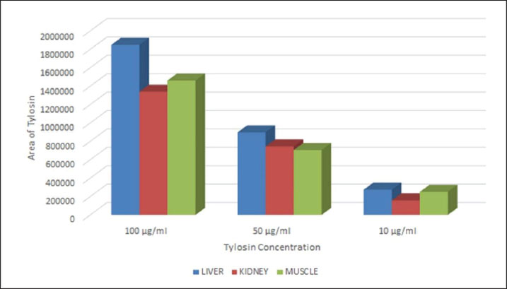 Fig. 2. Calibration graph for tylosin in the liver, kidney, and muscle at concentrations of 100, 50, and 10 μg/ml. Table 1. Validated method for quantifying norfloxacin concentration in broiler tissues.