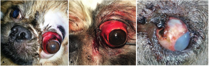 Fig. 1. Images of proptosed eyes in (A) 7-month-old Pekingese, (B) 18-month-old Griffon, and (C) 2-year-old mixed-breed dogs illustrating (A) periorbital swelling and entrapment of the eyelids behind the globe conjunctiva; (A,B) bruised, bloody, and swollen conjunctiva; and (C) corneal edema and marked lateral retraction of the globe. (B) Note the miosis associated with the proptosed eye in the Griffon dog. Table 1. Clinical findings after initial examination of 15 small-breed dogs with unilateral traumatic proptosis.