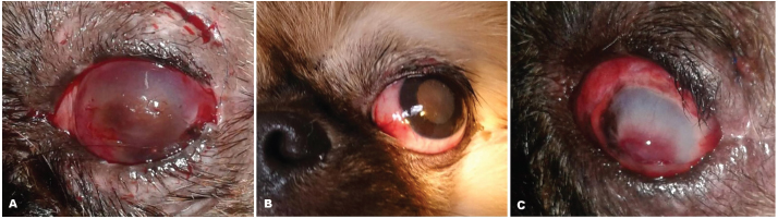 Fig. 3. Images of the eyes of three Pekingese dogs after successful globe replacement surgery and removal of the tarsorrhaphy sutures illustrating (A) keratitis with possible corneal pigmentation; (B) dilated pupil and lateral exotropia; and (C) early signs of atrophied globe with corneal fibrosis, central granulation tissue, and minimal lateral exotropia. Table 2. Vision assessment and short-term complications after globe replacement surgery of 15 small-breed dogs with traumatic proptosis.