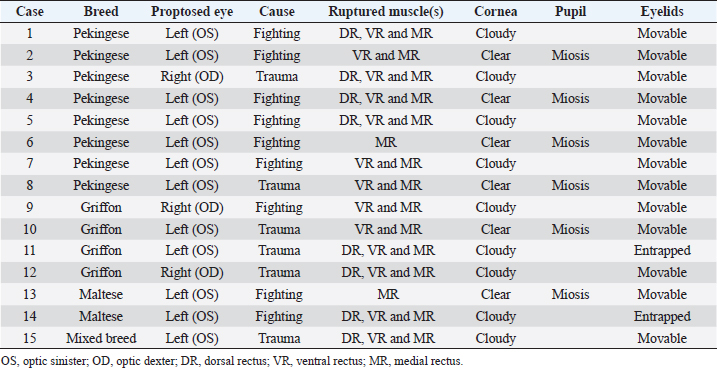 Open Vet. J.. 2019; 9(3): 222-229 doi: 10.4314/ovj.v9i3.6 Open Veterinary Journal, (2019), Vol. 9(3): 222–229 Case Report DOI: http://dx.doi.org/10.4314/ovj.v9i3.6 Clinical findings of traumatic proptosis in small-breed dogs and complications associated with globe replacement surgeryKhaled M. Ali and Ayman A. Mostafa*Department of Small Animal Surgery and Ophthalmology, Faculty of Veterinary Medicine, Cairo University, Cairo, Egypt *Corresponding Author: Ayman A. Mostafa. Department of Small Animal Surgery and Ophthalmology, Faculty of Veterinary Medicine, Cairo University, Giza 12211, Egypt. Email: aymostafa [at] cu.edu.eg Submitted: 14/01/2019 Accepted: 24/06/2019 Published: 04/08/2019 © 2019 Open Veterinary Journal AbstractBackground: Proptosis is a serious traumatic disease commonly affecting small breed dogs and possibly causing loss of vision, with globe replacement surgery (GRS) being essential in most of the cases after stabilizing the patient’s condition. Aim: To determine the common dog breeds and clinical findings associated with traumatic proptosis and demonstrate the short-term complications following GRS. Methods: The study was performed on 15 client-owned small-breed dogs presented with unilateral traumatic proptosis. Dogs were examined at initial presentation to determine the concurrent abnormalities associated with globe prolapse. The globe was replaced within the orbit and avulsed extraocular muscles were identified and sutured. Endoscopic examination of the ocular fundus was achieved 1 and 3 weeks after GRS in one Pekingese diagnosed with glaucoma. Complications following GRS were recorded. Results: Pekingese (53.3%) and Griffon (26.7%) were the most affected dogs with proptosis in Egypt. Bruised, hyperemic and swollen conjunctiva and periorbital tissue, lateral globe retraction, cloudy cornea, and miosis were common clinical findings associated with proptosis. Exposure keratitis, keratoconjunctivitis sicca, and exotropia were identified in all 15 patients at presentation. Complications following GRS included phthisis bulbi (53.3%), strabismus (26.7%), and lateral exotropia (20%). Intraocular pressure was reduced to 22 mmHg 3 weeks after GRS in the only patient diagnosed with glaucoma, and endoscopic evidence of optic nerve cupping was identified. Conclusion: Clinical findings associated with proptosis at initial presentation may have influenced the outcome of GRS. Favorable prognosis may be given to patients with relatively high potential for vision at initial presentation and ≤2 extraocular muscle avulsions. Immediate surgical intervention following the occurrence of proptosis should be advised to achieve favorable disease prognosis. Keywords: Clinical, Complications, Globe replacement, Proptosis, Small-breed dogs. IntroductionProptosis is an ophthalmic emergency condition characterized by partial or complete rostral displacement of the globe with respect to the corresponding orbit (Wheler et al., 2001). It is a serious traumatic disease commonly affecting small breed dogs, most likely brachycephalic dogs such as Shih Tzu, Pug, Pekingese, and Boston terrier (Mandel, 2000; Wheler et al., 2001). The disease most likely develops as a result of minimal lateral head trauma (Mandel, 2000; Wheler et al., 2001). The high incidence of proptosis in such dog breeds may be related to the prominent nature of their eye globes (Miller, 2008). Restraining small breed dogs by use of neck scruffs can occasionally cause a mild temporary proptosis (Mandel, 2000). In other dog breeds and cats, proptosis may develop secondary to a more violent blunt head trauma, such as an automobile accident. Proptosis commonly develops along with secondary contracture and entrapment of the corresponding eyelids behind the globe (Wheler et al., 2001; Crispin, 2005). These changes result in swollen periorbital tissues that potentially reduce the vitality of the globe and possibly cause loss of vision (Wheler et al., 2001; Crispin, 2005). Immediate surgical intervention via reduction of the globe is essential in most of the cases after stabilizing the patient’s condition (Mandell and Holt, 2005). Temporary multiple tarsorrhaphy sutures and routine ocular postoperative care are typically performed following reduction of the globe (Wheler et al., 2001). Enucleation should, however, be considered in the severely damaged globe (Wheler et al., 2001; Miller, 2008). Potential complications associated with proptosis included permanent strabismus, ulcerative keratitis, keratoconjunctivitis sicca, neuroretinal degeneration, and phthisis bulbus (Wheler et al., 2001; Mandell and Holt, 2005). However, the time interval between injury and initial surgical intervention is expected to influence the outcome of the treatment as well as the severity of associated complications (Mandell and Holt, 2005). The prognosis for patients with severely proptosed eyes and associated vision impairment is usually poor (Mandell, 2000). Furthermore, the prognosis for dogs with multiple extraocular muscle avulsions (≥ 3 muscles) is unfavorable and the globe should, therefore, be removed (Miller, 2008). On the contrary, presence of vision at initial presentation, absence of hyphema, minimal extraocular muscle damage, and normal fundus are the favorable prognostic indicators in most cases of traumatic proptosis (Gilger et al., 1995; Mandell and Holt, 2005; Miller, 2008). In partially proptosed eyes, the presence of direct and consensual pupillary light reflex is generally a good prognostic sign and yet its absence at initial examination cannot be considered poor prognostic indicator (Mandell and Holt, 2005). The purposes of the present study were to determine the common dog breeds affected with traumatic proptosis and to demonstrate the clinical presentation, vision assessment, endoscopic findings, and complications associated with such a disease. The aim of the study was also to evaluate the short-term complications after surgical