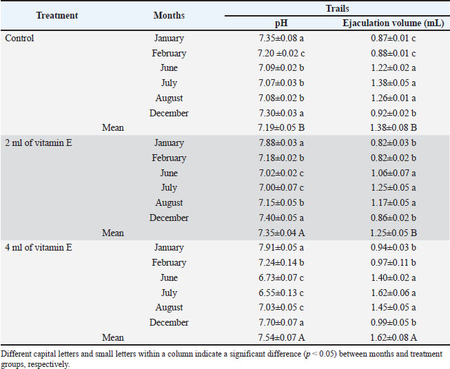 Rams were trained to collect semen using an artificial vagina at the beginning of the experiment. When the exercise period ended, monthly semen collection was performed from all animals. Semen samples were placed in a plastic tube and covered with medical cotton to protect the samples from both the lighting and cold shocks. Semen pH, ejaculation volume, mass motility, progressive motility, sperm concentration, live sperm, dead sperm, and abnormal sperm were measured according to the method of Carrillo-González and Hernández (2016). The obtained data were statistically analyzed using the general linear models within SPSS (2023). The study included two factors: the first factor was vitamin E with three levels, and the second factor was 6 months. The statistical analysis determined significant differences at the p < 0.05 level. The general statistical model was as follows: yijk=µ + Ti. + Mj + TMij + eijk where: yijk is the observation of the treatment within the month; µ, common mean; Ti. is the effect of the vitamin E levels [i=3, (0, 2, and 4 ml)]; Mj, the effect of the month (j=6 (January, February, June, July, August, and December); TMij, the effect of the interaction between treatment and months; and eijk, the experimental error, randomly and naturally distributed on all observations. Ethical approvalAll applicable national and international guidelines for animal care and use were followed. ResultsTable 2 shows the effect of prolonged vitamin E injection on the pH of the ram semen. A noticeable increase (p < 0.05) in pH values was recorded during January and December in all groups compared to other months. However, lower values were observed in July, ranging from 7.07 to 6.55. The pH values decreased significantly (p < 0.05) when rams were injected with 4 and 2 ml of vitamin E compared with the control. The mean values were 7.54, 7.19, and 7.35. The pH of semen dropped in rams treated with 2 ml of vitamin E, particularly in July (7.00), while the highest levels were recorded in December (7.30) and January (7.35) in the control group. Vitamin E injections improved the pH values and brought them closer to neutrality, especially during the winter months. Table 2. Effect of vitamin E injection on the pH and ejaculation volume of fresh semen from Arabi rams during different seasons.
