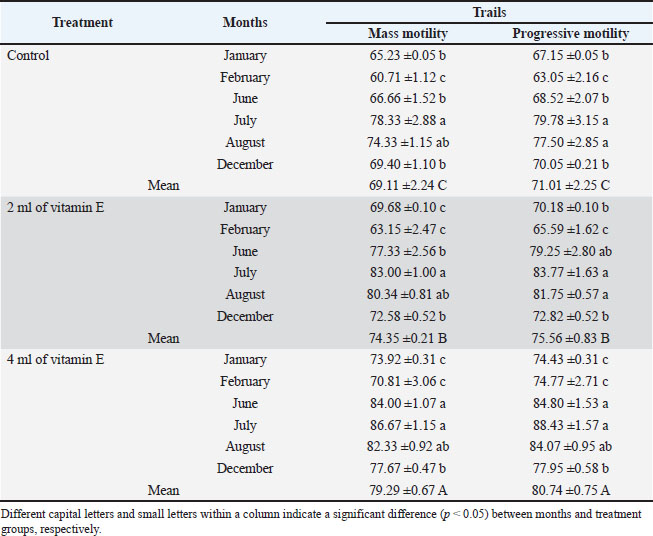 The mean values of ejaculation volume, mass motility, and progressive motility were significantly different between months (Tables 2 and 3). These parameters were markedly higher in July, August, and June (summer) than in the winter. The ejaculation volumes of rams treated with two doses (4 and 2 ml) of vitamin E and the control group were 1.62, 1.25, and 1.38 ml, respectively, and 79.22%, 74.35%, and 69.11% to mass motility, respectively, and 80.74%, 75.56%, and 71.01% to progressive motility, respectively. Lower values of ejaculation volume (1 ml) were observed in December, January, and February, whereas the lowest values of both mass and progressive motility were recorded in February. There was no significant increase in the ejaculating volume of rams treated with 4 ml of vitamin E compared with rams treated with 2 ml of vitamin E. The mass and progressive motility increased significantly (p < 0.05) when the rams were injected with 4 ml of vitamin E compared with the control and rams treated with 2 ml of vitamin E. Furthermore, the increases in the trials above were clearer in July than in other months. Table 4 shows that the sperm concentration increased significantly (p < 0.05) in February and August compared with other months. The lowest values were observed in January, which ranged between 2.03 and 1.85 × 109/ ml. The interaction between vitamin treatment and the month of the year showed that injection of 4 ml of vitamin E into rams caused a decrease in sperm concentration, especially in January. Table 3. Effect of vitamin E injection on mass and progressive motility (%) of fresh ram semen during different seasons.