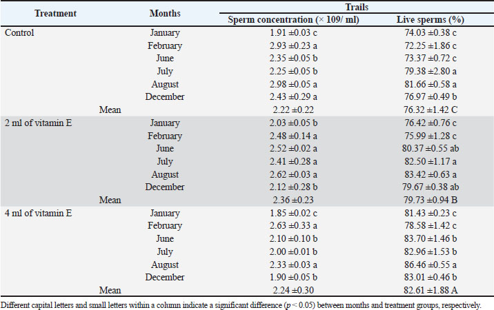 Table 4. Effect of vitamin E injection on sperm concentration and live sperms of fresh ram semen during different seasons.