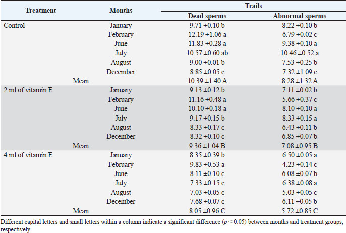 Tables 4 and 5 show the effects of vitamin E on live, dead, and abnormal sperm. The live sperm percentage increased significantly (p < 0.05) in August and July (86.46, 82.96, and 83.42, 82.50, and 81.66, 79.38) in rams treated with 4 and 2 ml of vitamin E and in the control group, respectively, compared with that in winter. The lowest values of live sperm in all groups were shown in February. The percentage of dead sperm decreased significantly (p < 0.05) during August and December (Table 5). Table 5. Effect of vitamin E injection on dead and abnormal sperms (%) of the fresh semen of rams during different seasons.