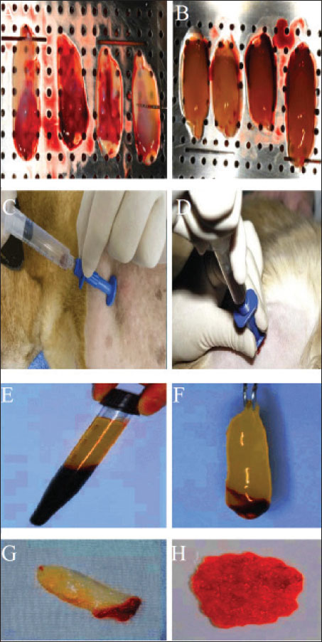 Fig. 5. Preparation of the platelet-rich fibrin (PRF) clot–bone marrow (BM) aspirate blend under aseptic technique. (A) The PRF was produced by centrifugation of whole blood, without anticoagulant, at 2,700 rpm for 7 minutes; the clot produced has a jelly-like appearance, as can be seen in (A, B, F, G, and H). Three milliliters of BM aspirate were collected from the upper arm using a special needle to harvest the BM aspirate (C, D). (E) Some of the BM aspirate was injected into the PRF clot.