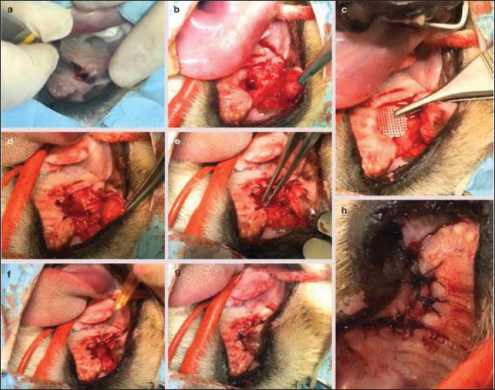 Fig. 6. Surgical repair of oronasal fistula in F. silvestris. (A–C) Elevation of a mucoperiosteal pedicle flap to achieve tension-free closure. (D) Debridement of fibrotic wound margins with a sterile tungsten carbide burr (20,000 rpm under saline irrigation). (E) Subperiosteal implantation of a 3D-printed polyethylene glycol diacrylate (PEGDA) scaffold (10 × 8 × 2 mm), fixed with fibrin adhesive (TISSEEL®; Baxter). (F) Application of platelet-rich fibrin–bone marrow aspirate (PRF-BM) matrix to the scaffold surface. (G, H) Layered closure: deep fascia approximated with 4-0 polydioxanone (PDS® II; Ethicon) interrupted sutures (3 mm spacing), followed by 3-0 polyglecaprone (Monocryl®; Ethicon) intradermal sutures superficially. Postoperative management included lingual papillae abrasion (#15 scalpel blade) and esophageal feeding tube (12Fr MILATUBE®; Mila International) placement to reduce mechanical trauma. Scale bars: 5 mm (A–D, G, and H); 2 mm (E and F). PCR validationSuccessful amplification of the 16S V3–V4 region (~550 bp) was confirmed by 1.5% agarose gel electrophoresis (Fig. 9). Statistical examinationData normality was assessed with Shapiro–Wilk test. Differences in diversity indices and bacterial taxa abundance between time points were evaluated using Kruskal–Wallis tests with Dunn’s post hoc correction. The significance threshold was set at p < 0.05. Data visualization was performed using R v4.2.2 and GraphPad Prism v9.5 (R Core Team, 2015). The Shapiro–Wilk test confirmed data normality (p > 0.05). All values are reported as Mean ± SD (SEM: X). Power analysis was waived due to the single-case design; effect sizes (Cohen’s d) were calculated for all comparisons. Our investigation revealed significant alterations in the oral microbiota of wildcats following ONF injury. The creation of an ONF resulted in a marked decrease in bacterial diversity (Shannon index: pre-injury 5.2 ± 0.3 vs. post-injury 3.1 ± 0.4; p < 0.05) and a substantial increase in the relative abundance of opportunistic pathogens, particularly Enterococcus faecalis (from 0.5% to 12.8%) and Staphylococcus species (S. lentus and S. xylosus combined from 1.2% to 9.6%). Beta diversity analysis demonstrated persistent changes in microbiome composition for up to 7 days post-injury (Performance-based Multiple-Analyzed NOVA, p=0.002). Additionally, we observed a significant increase in total bacterial load, with 16S rDNA copies rising from 104 to 106 copies/μl (p < 0.01) (Table 2). Table 1. Longitudinal assessment of postoperative recovery indicators in patients with F. silvestris following oronasal fistula repair.