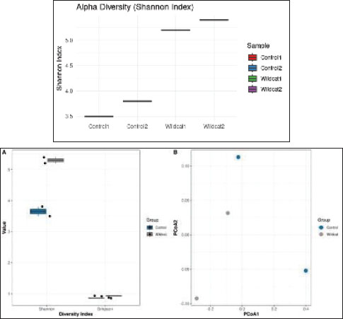 Fig. 7. Microbial diversity in the oral microbiota of F. silvestris. (A) Alpha diversity indices (Shannon, Simpson, and observed OTUs) demonstrating species richness and evenness. (B) Principal coordinates analysis (PCoA) plot of beta diversity based on Bray-Curtis dissimilarity, showing clustering patterns between experimental groups and controls. Antibiotic treatment with a combination of ampicillin (1 mg/ml), vancomycin (0.5 mg/ml), neomycin (1 mg/ml), and metronidazole (1 mg/ml) in drinking water for 1 week effectively reduced the bacterial load by 99.9% (p < 0.001) and completely eradicated E. faecalis. However, this dramatic reduction in microbial burden did not translate to improved ONF healing, as lesion sizes at day 7 post-injury showed no significant difference between the antibiotic-treated and control groups (5.2 ± 0.8 mm vs. 5.0 ± 0.7 mm, respectively; p=0.89). These findings suggest that while antibiotics successfully diminish bacterial load, they do not substantially enhance the wound healing process in this context. Biomarker data were analyzed using repeated-measures ANOVA with Geisser-Greenhouse correction. Long-term oral functionality was assessed using the following observational metrics: mastication efficiency (evaluated by consumption of solid food by POD 8), absence of nasal regurgitation, and behavioral indicators (olfactory exploration and weight gain). Computed tomography scans confirmed anatomical integrity, with no functional deficits at 10 months.