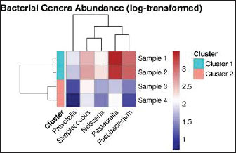 Fig. 8. Dominant bacterial genera in F. silvestris oral microbiota.Heatmap showing the relative abundance of the predominant genera. The color gradient represents the log-transformed abundance values (blue: low; red: high).