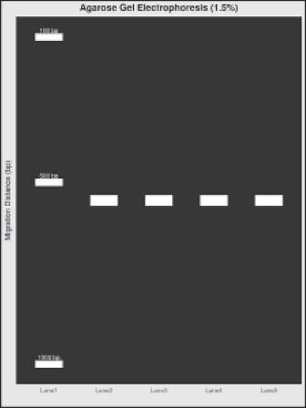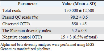 Fig. 9. 16S rRNA gene amplification. Lane 1: DNA ladder; Lane 2: Positive control (Mock Community Standard); Lanes 3–5: F. silvestris samples; Lane 6: Negative control. Table 2. Sequencing metrics of 16S rRNA analysis (Mean ± SD).