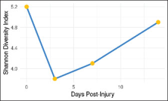 Fig. 10. Changes in microbial diversity (Shannon index) following ONF injury. Significant decrease in alpha diversity (p < 0.05) immediately after injury, with gradual recovery by day 14. The error bars represent SEM.