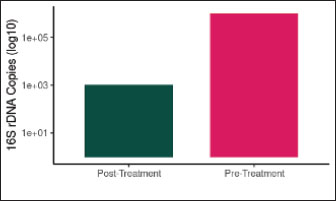 Fig. 11. Bacterial load (16S rDNA Copies) before and after antibiotic treatment. The bacterial load was reduced by 99.9% following antibiotic therapy (p < 0.001). The Y-axis shows log10 transformed values. Effect of antibioticsDespite a 99.9% reduction in total bacterial load (p < 0.001), wound closure rates were not significantly different between treated and untreated historical controls with similar lesions (p=0.89), suggesting that microbial suppression alone does not enhance healing in chronic ONFs (Lu and Li, 2023). Although antibiotics reduced the bacterial load by 99.9% (p < 0.001), their limited impact on wound closure (p=0.89) indicates that microbial suppression alone is insufficient for healing chronic ONFs. This underscores the mechanical role of the scaffold, as discussed in the previous lines. This finding aligns with the concept that microbial suppression alone, without restoring ecological balance, is insufficient for promoting healing (Cho and Blaser, 2012). This underscores the importance of mechanical tissue support provided by the scaffold and PRF-BMC. Concurrent with microbiome shifts, inflammatory biomarkers showed significant temporal changes (Table 4, Figs. 13–15). IL-6 levels peaked at POD 7 (320.4 ± 18.7 pg/ml, p < 0.001), correlating with Enterococcus abundance (r=0.79, p=0.002). The IL-6/Shannon correlation (r=−0.82, 95% CI [−0.91, −0.67], p < 0.001) remained significant after the Bonferroni correction.